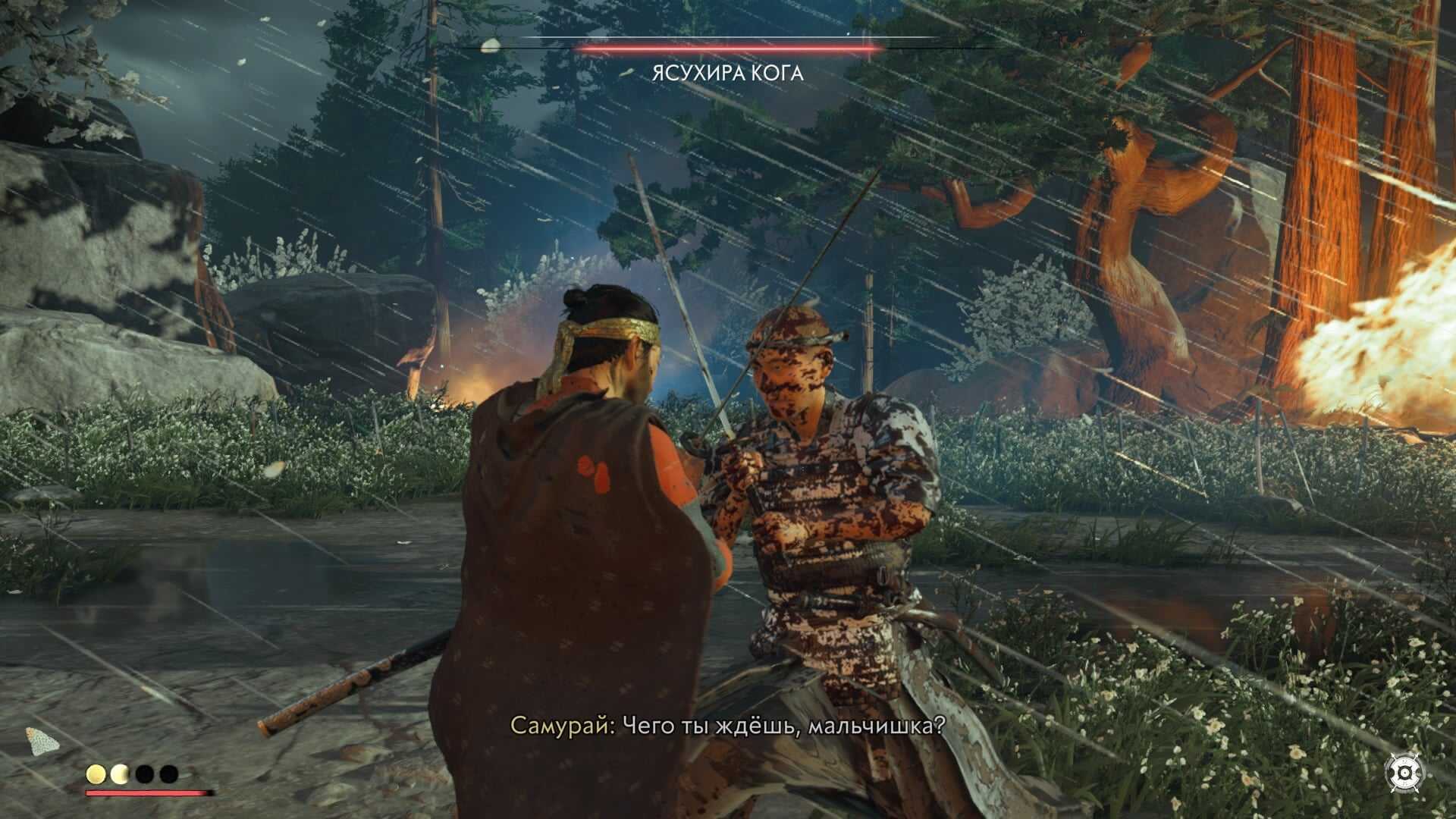 Даже самый базовый тип боя, открытое сражение с катаной в руках, полон нюансов. Более-менее развитому Дзину доступно четыре стойки, каждая из которых эффективна против разных врагов: мечников, щитоносцев, здоровяков, копейщиков. Стойки отличаются как анимациями быстрой и тяжелой атак, так и уникальными связками и приемами – например, в стойке против копейщиков врагов (не только с копьями) можно отбрасывать ударом ноги, а Дзин-антитяжеловес вращается с катаной в руках, нанося урон по площади. Вражеские атаки можно парировать, проводя стремительную контратаку, блокировать, отступать в сторону, перекатываться. Какие-то атаки блокировать нельзя (подсвечиваются красным бликом), другие можно, но только при наличии определенного умения. На словах звучит, возможно, запутано, но эти нюансы добавляются постепенно, так что усвоить их не составляет труда.