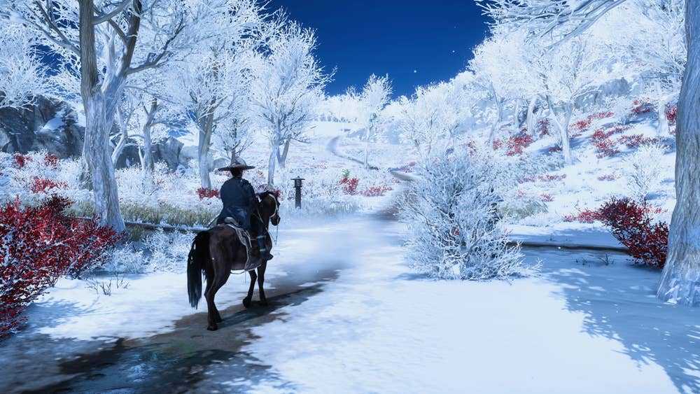 Карта во-первых, насыщена теми самыми вопросительными знаками, а во-вторых, что не менее важно, очень разнообразно выглядит. Пожертвовав долей реализма (опять-таки, разработчики и не претендуют на достоверность), авторы сделали Цусиму миниатюрой целого мира: один регион покрыт снегом и льдами, в другом раскинулись ярко-зеленые поля и бамбуковые леса, в третьем я сделал под сотню снимков в фото-режиме, потому что там деревья с золотыми и красными листьями