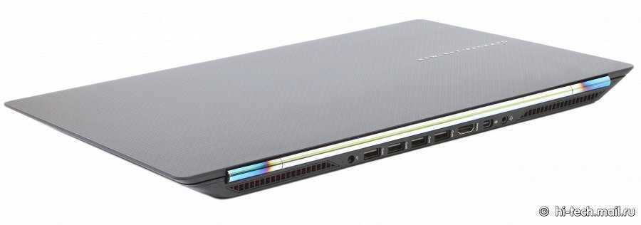 Дизайн ноутбука довольно спокойный, по сравнению с тем же MSI или иными. И все же трудно с первого же взгляда не понять назначение этой модели. Явно не офисная машинка. Корпус из алюминия, за исключением нижней панели, и он вполне жесткий, хотя при нажатии на крышку экрана и клавиатуру может наблюдаться некоторое прогибание. Все это некритично, и больше похоже на придирки.
