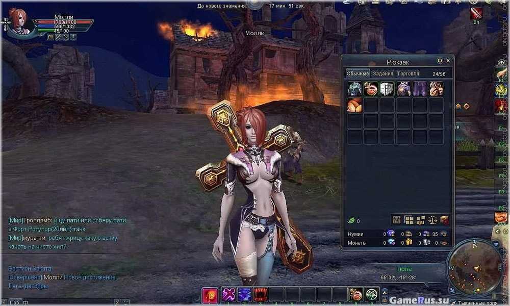 По интерфейсу персонажа: в верхнем левом углу – здоровье, мана и ярость, очки опыта. Правее – кнопки с характеристиками персонажа: информация по здоровью, атаке, защите, уклону, энергии и терпению, предметы экипировки, умения и т.д.