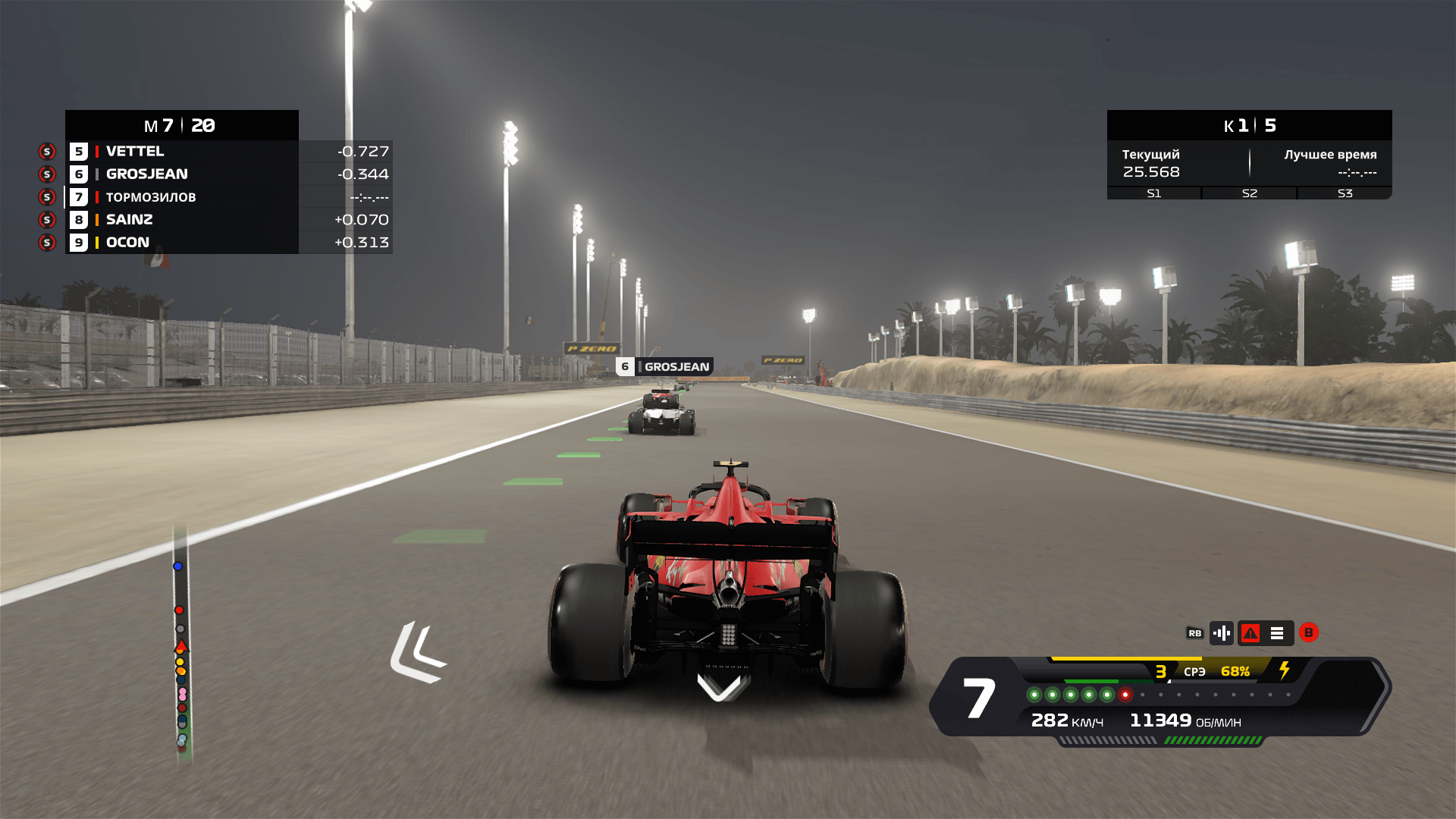 - Посмотрите назад — при игре на контроллере наклоните правый стик вниз; играя на руле, назначьте на это действие отдельную кнопку. Это особенно полезно на длинных прямых, которые позволяют активировать DRS (атакующий водитель получает временное увеличение скорости), потому что именно тогда следует ожидать атак чаще всего. Вы можете переместиться заранее, чтобы затруднить обгон.