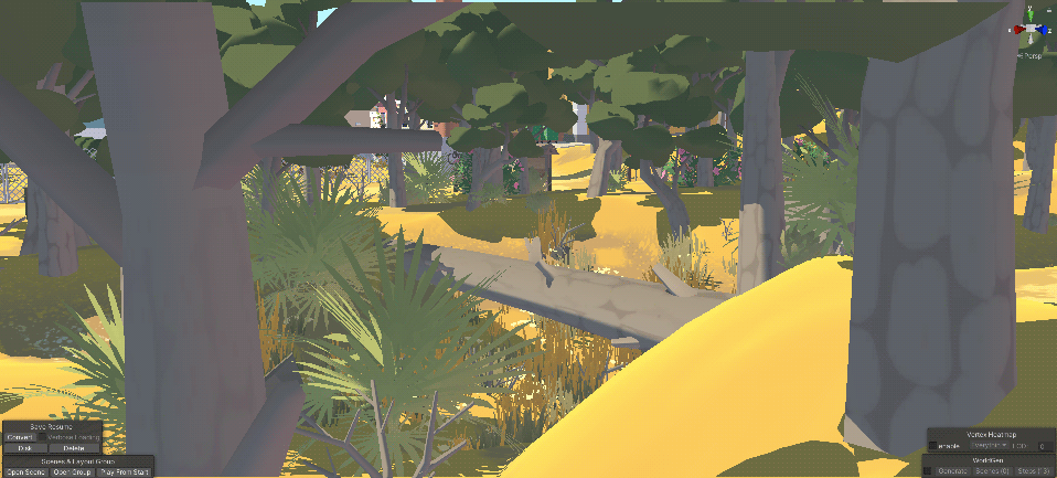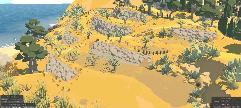 All of these terrain tools were very useful to get a good base together on which we could decorate. When the polish stage came around we decided to remove some of the procedural areas to then hand place assets again for a better level of control.