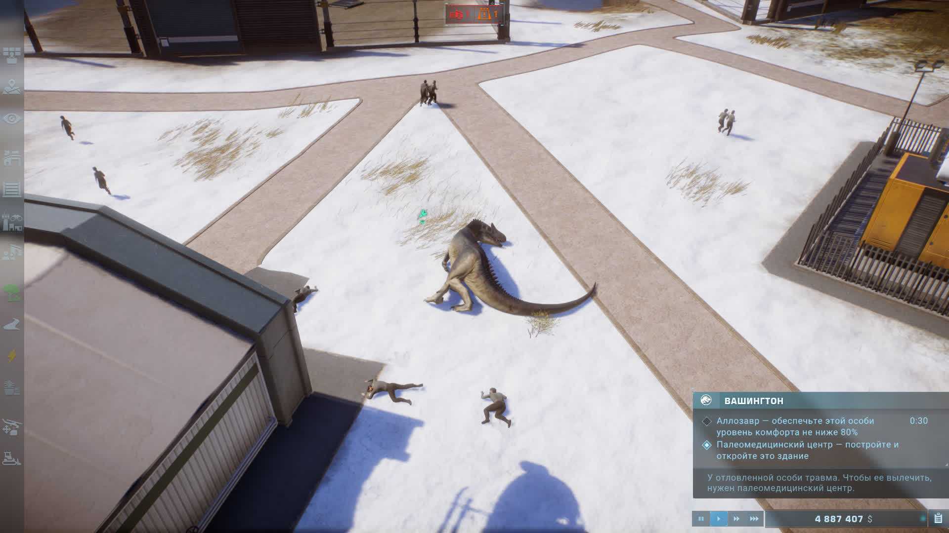 Итак, главная претензия к игре — у нее искусственно усложнены механики. Процессы, которые в других градостроительных и экономических стратегиях решаются парой кликов, здесь растянуты и неудобны. Скажем, у меня заболело стадо динозавров, штук десять. Что по идее я должен сделать? Выбрать медиков, назначить оперативную группу, провести исследование и дальше заниматься другими делами.