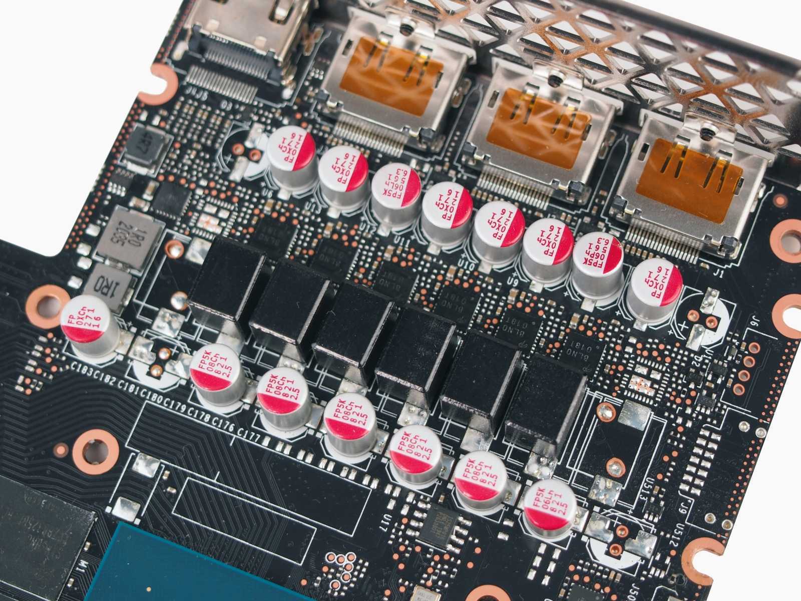 Без системы охлаждения печатная плата RTX 3060 Ti Twin X2 OC смотрится значительно компактнее общих габаритов видеокарты. Размещение электронных компонентов выполнено настолько плотно, что на PCB почти не остается свободного места.