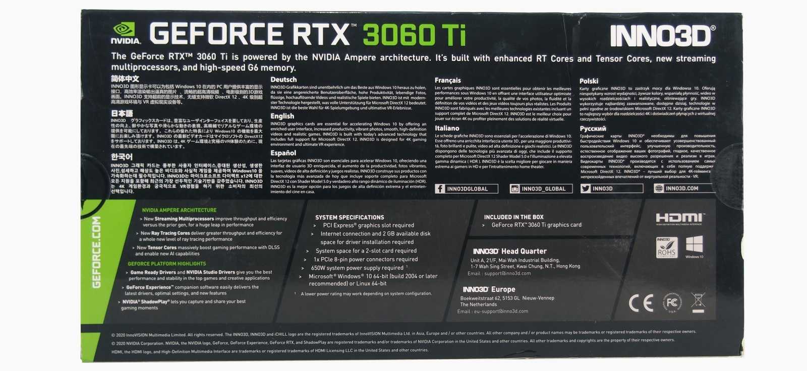 Видеокарта использует 256-битную шину памяти GDDR6 объемом 8 Гб. Поддерживаются все новомодные технологии NVIDIA, включая Ray tracing и DLSS. Подробные технические характеристики RTX 3060 Ti Twin X2 OC указаны на тыльной стороне коробки.