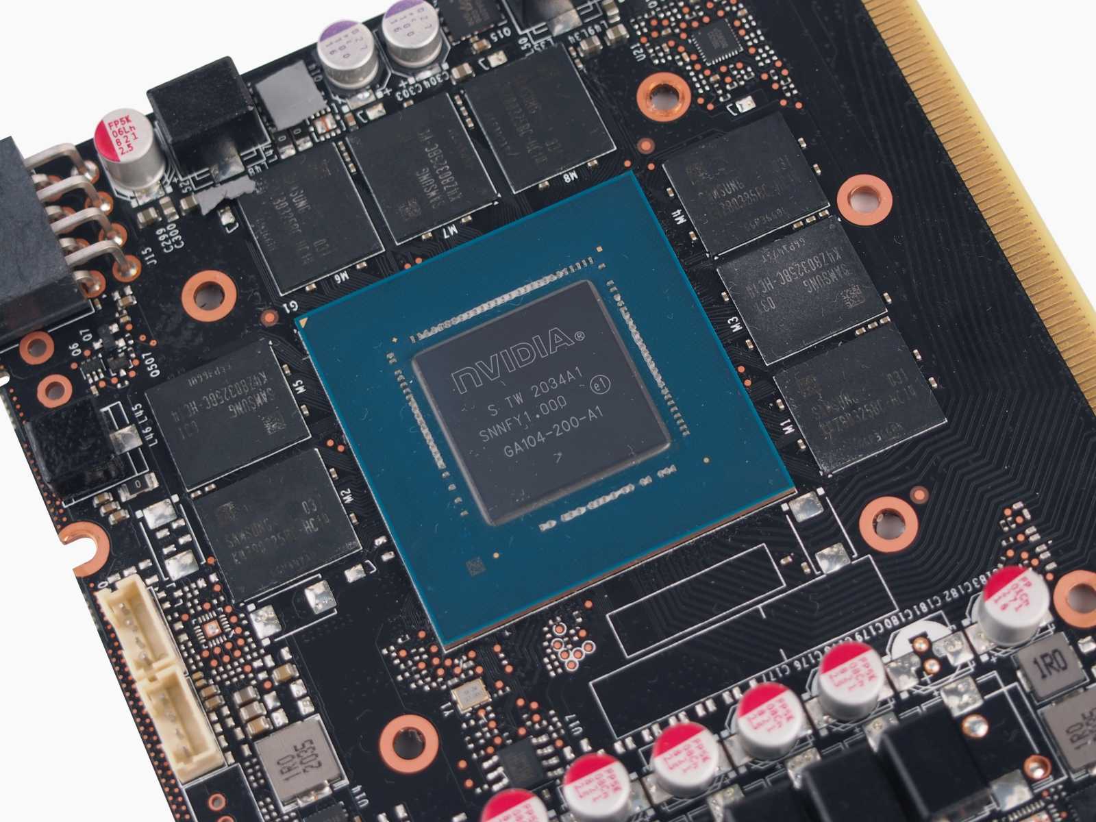 Основу вычислительной мощности RTX 3060 Ti Twin X2 OC составляет графический процессор Ampere GA104-200-A1, внутри которого таится 4864 ядер CUDA, 80 растровых и 152 текстурных блока. Также на вооружении этого GPU имеются 38 ядер RT и 152 тензорных ядра. Номинальная рабочая частота этого графического процессора составляет 1410 МГц, но за счет Boost технологии GPU на RTX 3060 Ti Twin X2 OC работает на частоте 1680 МГц. Система питания видеокарты состоит из 8 фаз, шесть из которых приходятся на GPU, а две оставшиеся — на чипы памяти.
