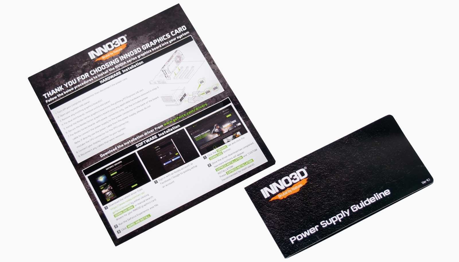 Вместе с видеокартой пользователь обнаружит карточку благодарности с инструкцией по установке в игровой ПК. Также в комплектации RTX 3060 Ti Twin X2 OC присутствует гайд по требуемой мощности блока питания для стабильной работы графического адаптера.