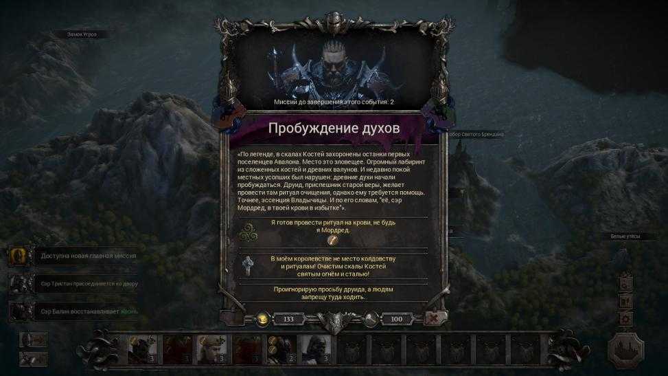 Здесь же, на глобальной карте, мы периодически сталкиваемся со случайными событиями, требующими нашего решения. Перебить всех разбойников, готовых сдаться и перейти под командование Мордреда после гибели своего лидера, или взять их к себе и получить дополнительные ресурсы для отстройки замка? Восстановить языческие символы в одном из поселений или возвести церковь? Наказать управляющего замком за то, что он в ярости прибил одного из подчинённых, или отделаться компенсацией семье пострадавшего? Эти и многие другие решения (принимаемые, впрочем, не только на глобальной карте, но и во время миссий) влияют на мораль и мировоззрение главного героя. Он может быть справедливым или деспотичным, язычником или христианином — и каждая ветка даёт свои бонусы.