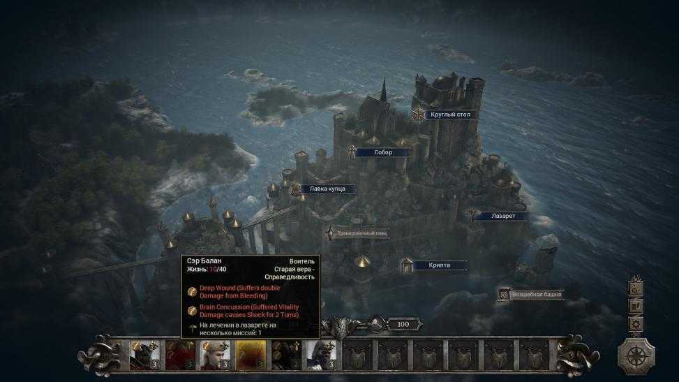 Разделение геймплея на стратегию на глобальной карте и непосредственно сражения делает игру многогранной и разбавляет ратные подвиги другими заботами. Здесь мы не только выбираем следующие миссии и состав отряда (максимум в него входят четверо рыцарей), но и отстраиваем за собранные ресурсы замок Камелот. Помимо лазарета для раненых в нём можно возвести собор, где герои избавляются от ран, влияющих на их показатели, тренировочную площадку, различные лавки с обычными или магическими предметами и другие полезные постройки.