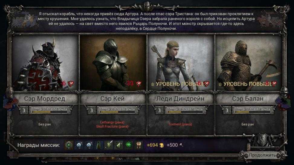 Наконец, именно в Камелоте в перерывах между боевыми миссиями мы экипируем героев (предметы разной степени крутости можно найти во время заданий и также купить в замке) и разучиваем навыки за очки, полученные при повышении уровня. Умения же, понятно, уникальны для разных классов, среди которых есть воитель, убийца, чародей, лучник, мистик и другие. Навыки снижают повреждения, увеличивают наносимый урон (например, от яда или кровотечения), позволяют замечать ловушки, дают скрытность или ярость (бонус к урону после каждого убийства) и так далее — в целом всё более-менее знакомо.