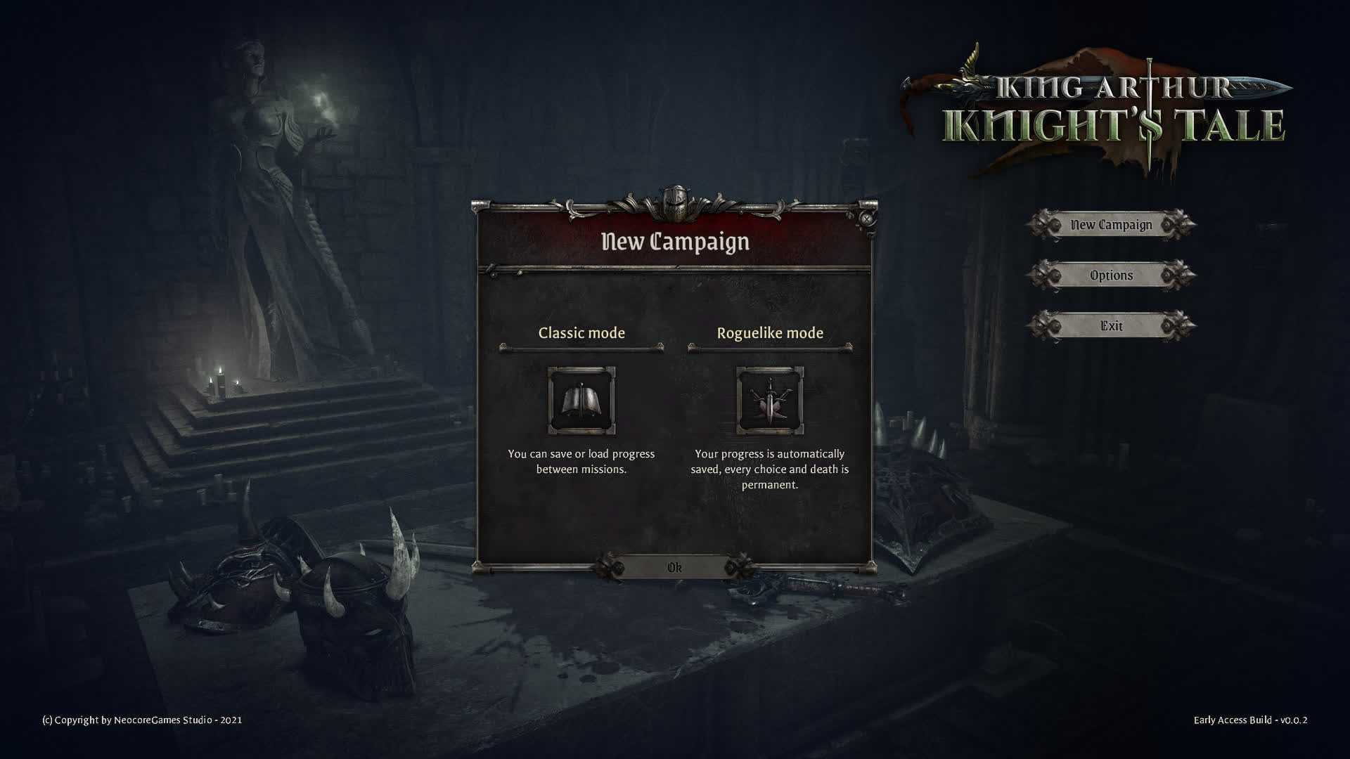 Старт новой кампании, выбор режима — классика или рогалик. Русского языка нет, даже в интерфейсе и в виде субтитров.