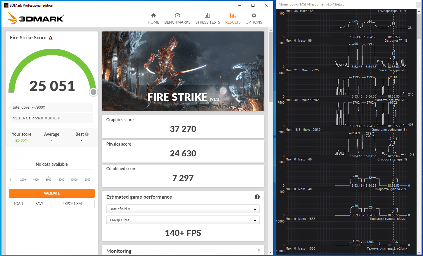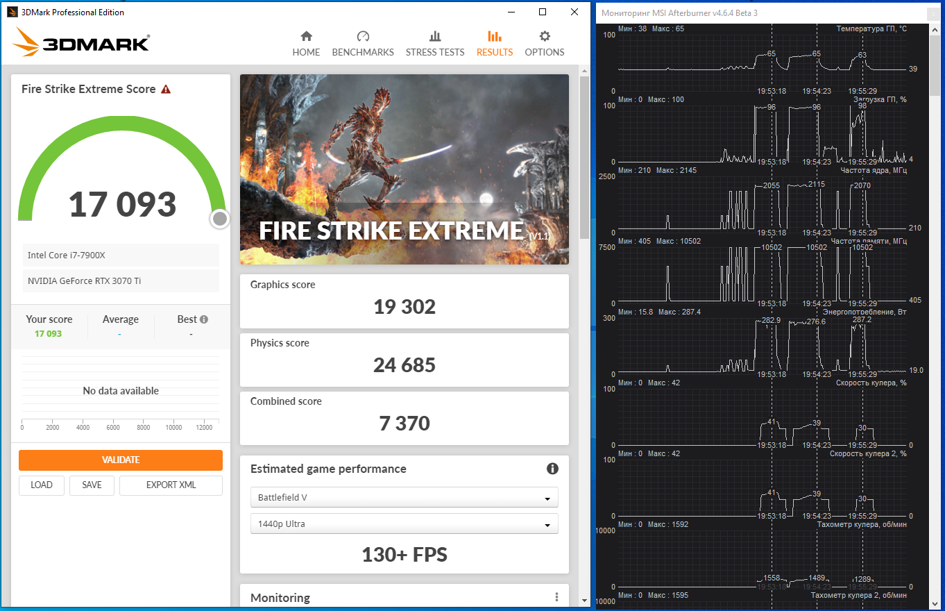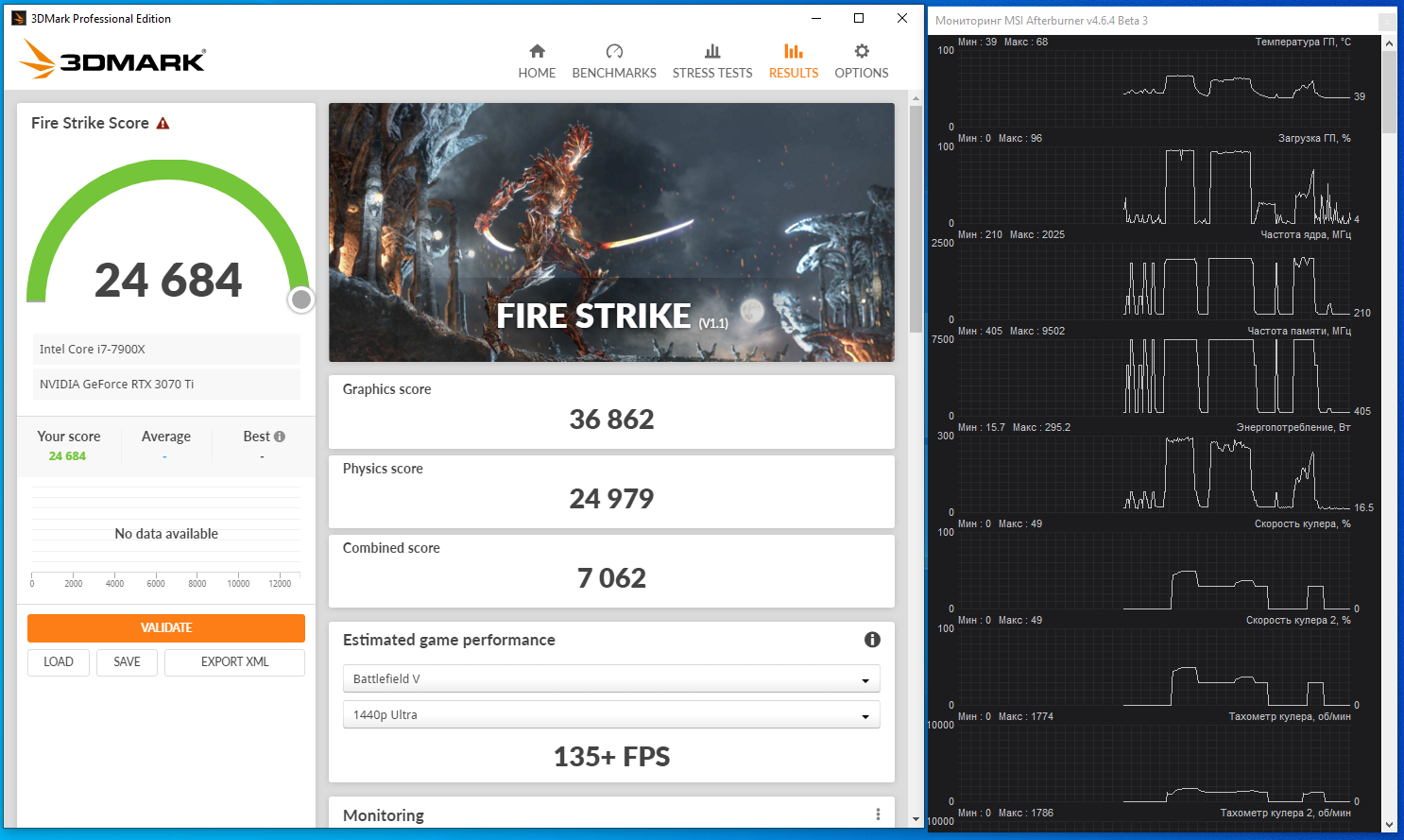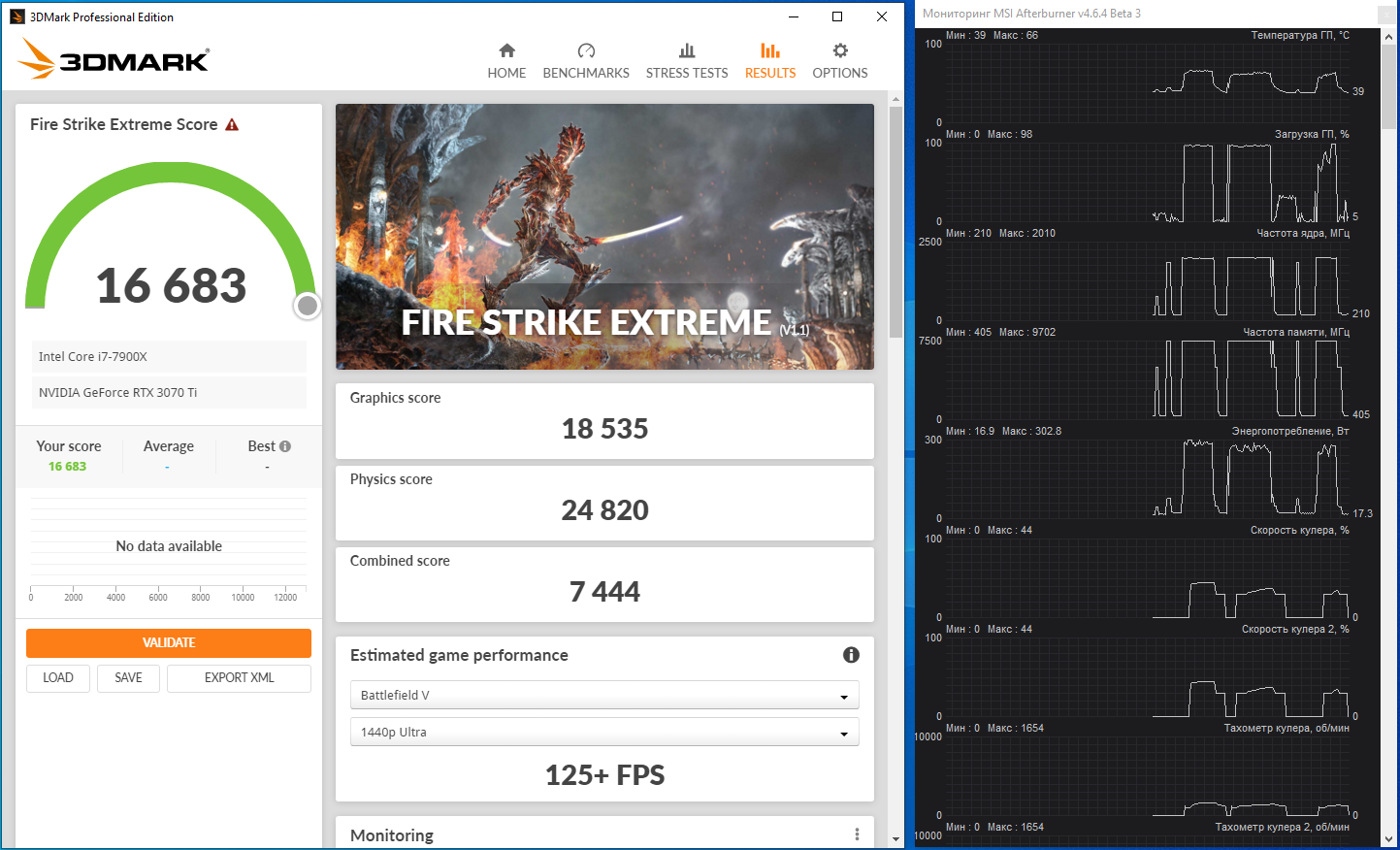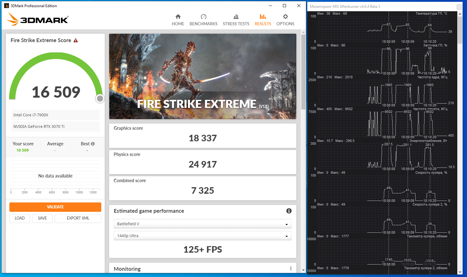 В 3DMark FireStike и FireStrike Extreme в стоке карта набрала 36 862 и 18 337 баллов соответственно по оценке Graphics Score. Обороты вентиляторов не превышали 50%, а частоты колебались на уровне 1965-1980 МГц и редкими «прострелами» до 2010 МГц.