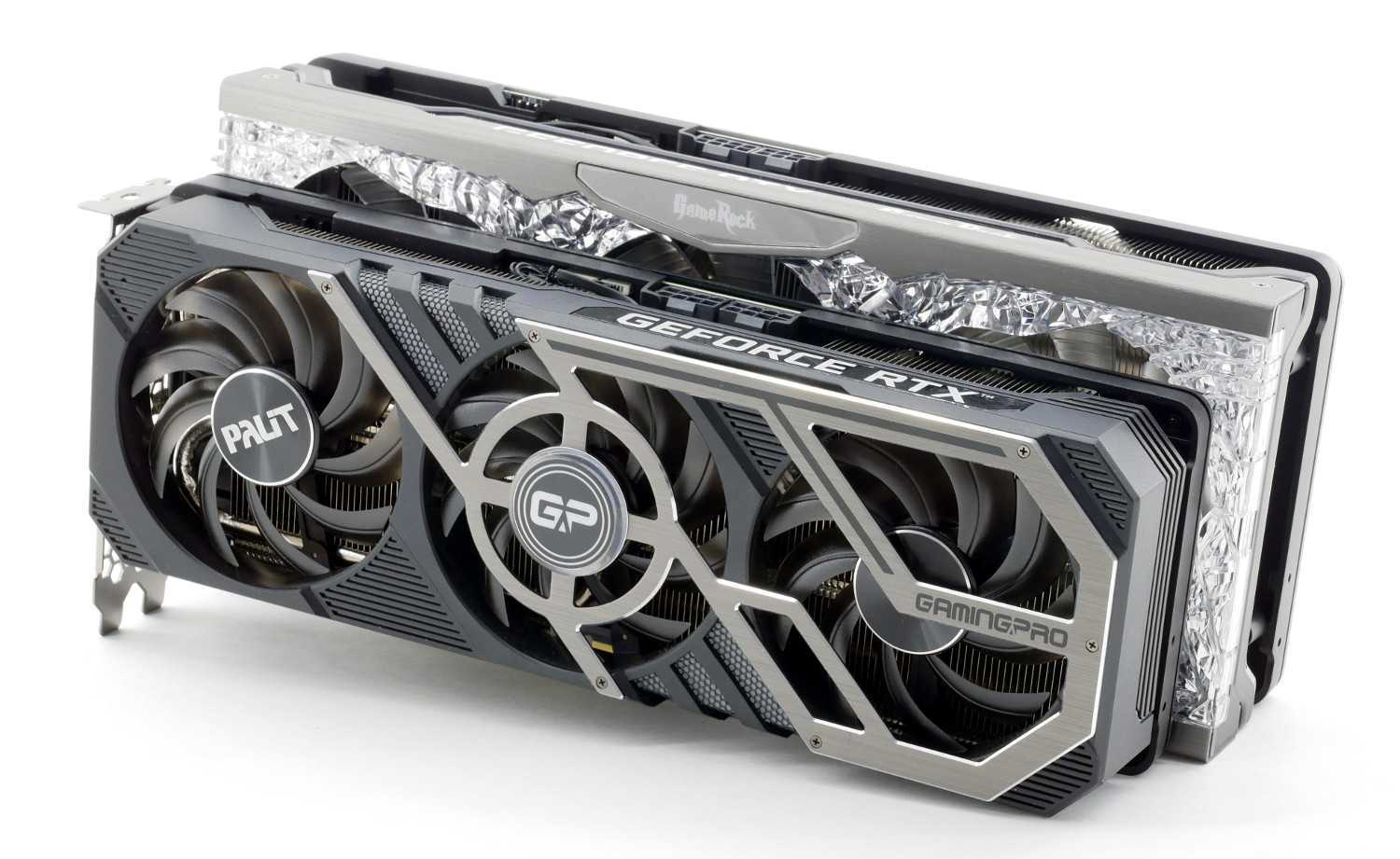 Серия GameRock славна некислым заводским разгоном, и в этом плане Palit GeForce RTX 3070 Ti GameRock OC не исключение. Частота работы ядра повышена до 1845 МГц. Среди RTX 3070 Ti это не наибольший показатель, но близкий к максимальным 1875 МГц. «Средняя по палате» – 1800-1830 МГц. Таким образом, это одна из быстрейших RTX 3070 Ti в стоке, что сразу в копилку плюсов. С завода видеопамять не разогнана, а жаль. С разгоном памяти производители почти совсем перестали баловаться. Также лимит мощности увеличен с 290 Вт до 330 Вт.