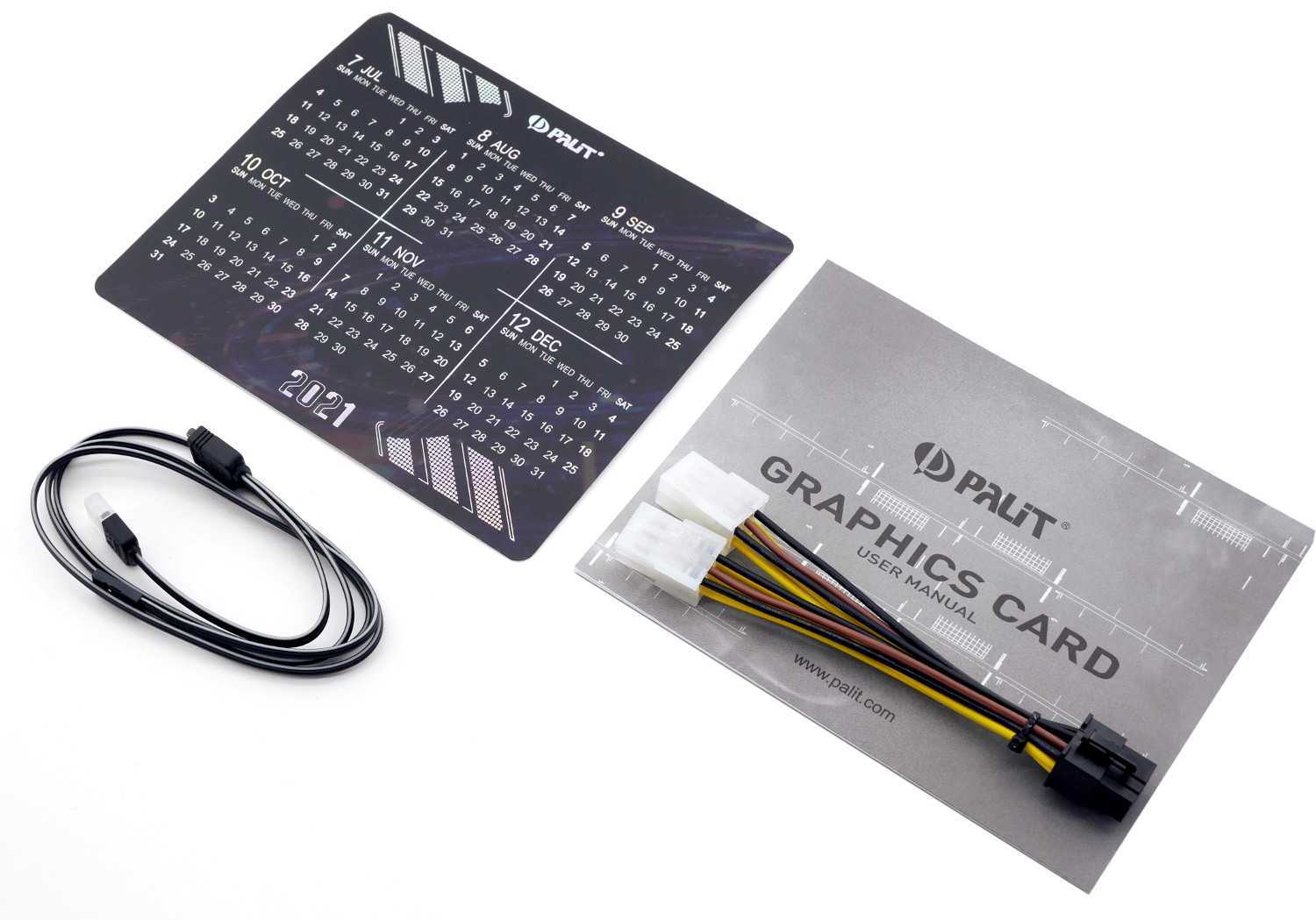 Большое количество читателей со скупой слезой вспоминает комплектации видеокарт прошлого, когда помимо руководства по установке и диска была целая горка аксессуаров. И компания Palit приятно удивляет: обе модели содержат мануал и приятный календарь на 2021 год, переходник питания 2×6-Pin > 8-Pin, а старшая новинка еще и предлагает кабель-переходник 3-Pin ARGB для подключения внешнего устройства подсветки.