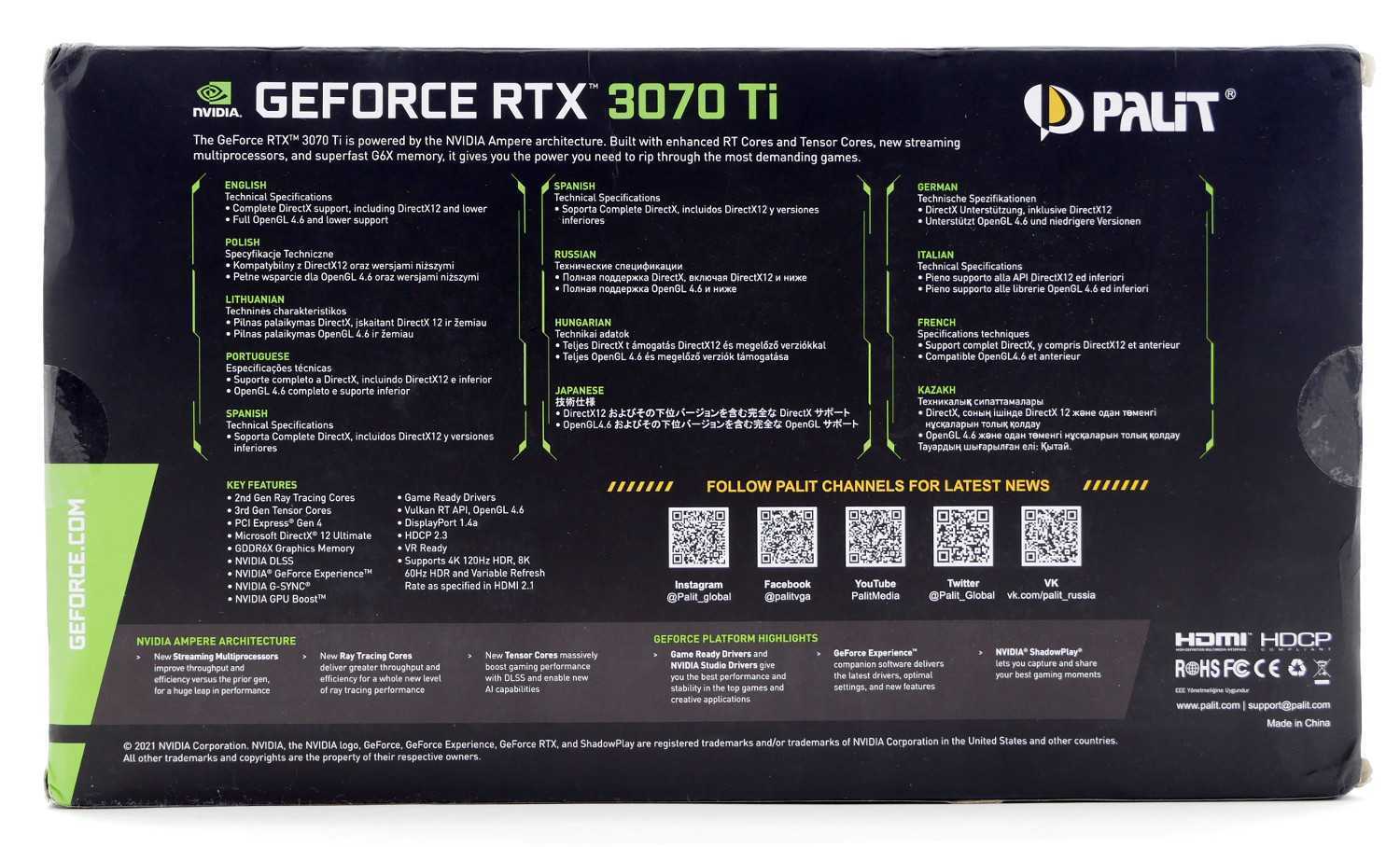 Видеокарты поставляются в больших упаковках одного размера, но полностью антагонистских дизайнах. Младшая модель Palit GeForce RTX 3070 Ti GamingPro довольствуется черной полиграфией с характерным изображением видеокарты, пролетающим через черную дыру, в то время как топовая версия GameRock красуется белоснежной коробкой с элегантным стилем серии.