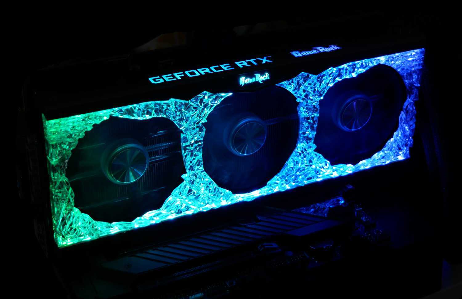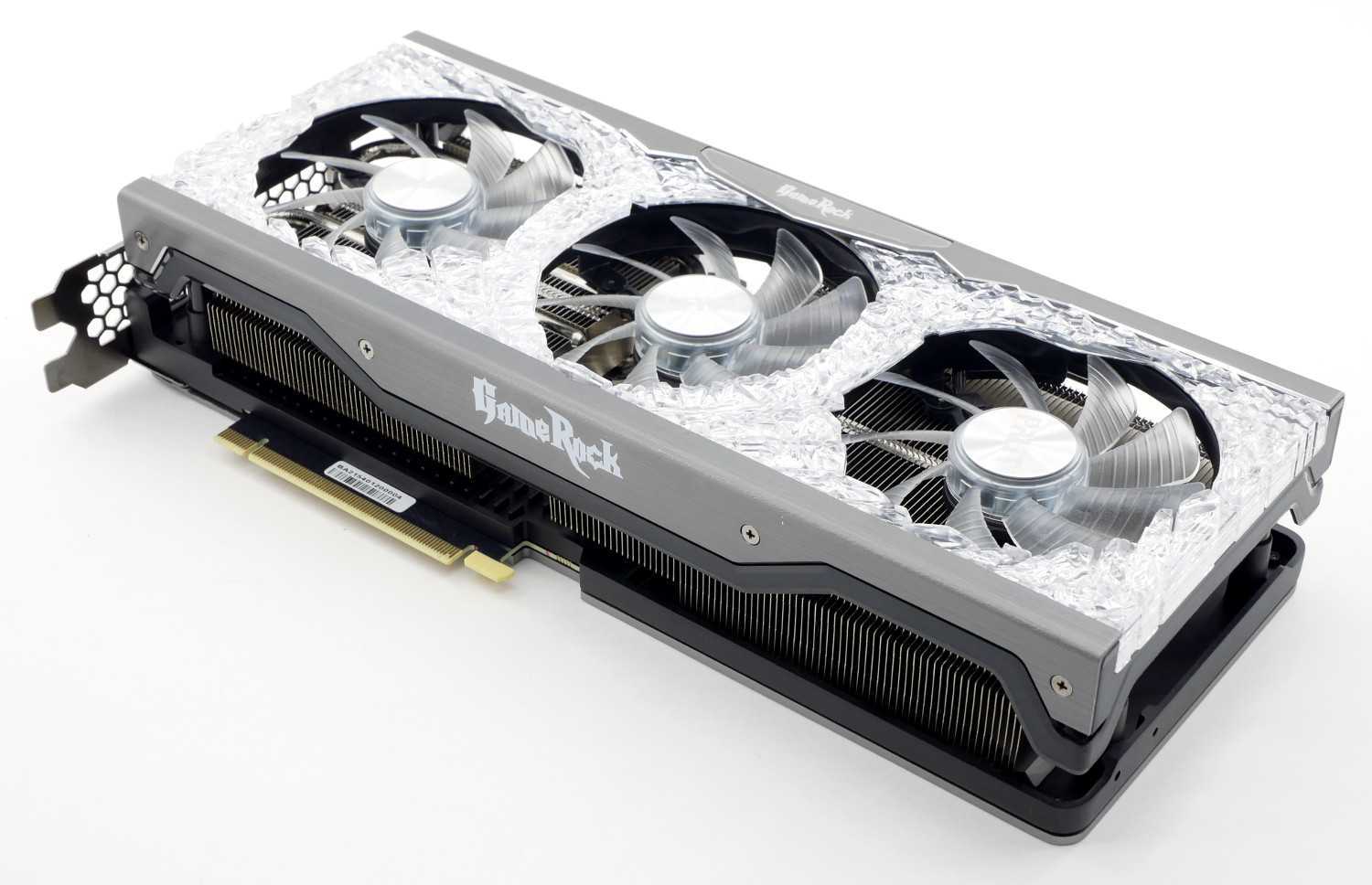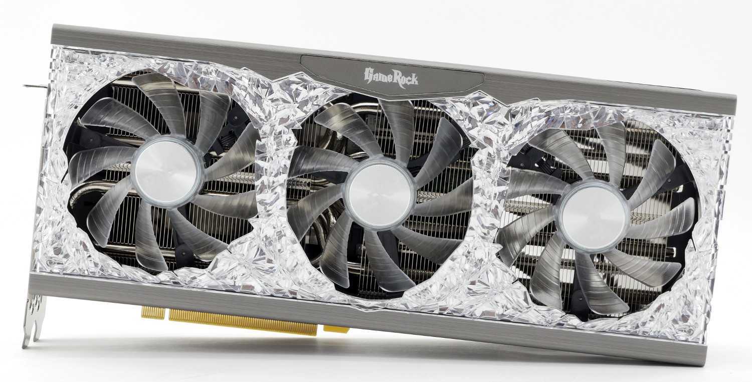 Зарождение концепции видеокарты Palit GeForce RTX 3070 Ti GameRock происходило у создателей под явным впечатлением от оперативной памяти G.Skill Trident Z Royal, которая одной из первых щегольнула пестрым дизайном самоцветов. Вдобавок инженеры постарались сделать новинку мощнее по производительности и эффективнее по системе охлаждения, поэтому она стала крупнее, шире и тяжелее. Габариты выросли до 304 мм в длину и до 136 мм в ширину — вентиляторы с более массивной крыльчаткой потребовали достаточно места. К тому же она получила ряд некоторых технических особенностей, о которых мы поговорим далее.