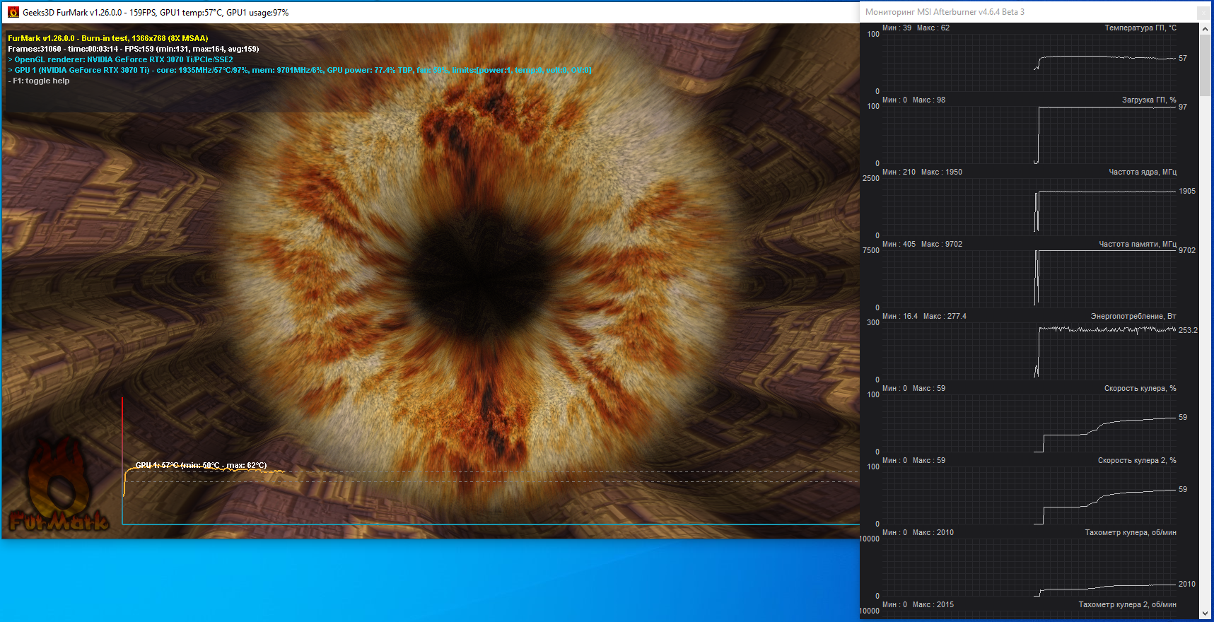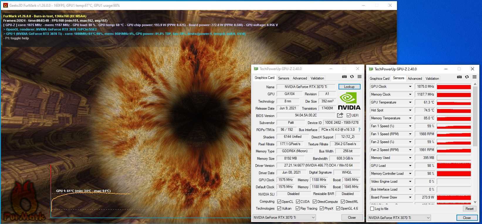 А дело в том, что RTX 3070 Ti, как и все видеокарты с памятью GDDR6X, управляет вентиляторами не только на основе температуры графического чипа, но и памяти, а GDDR6X горячая. Графический чип ещё не прогрелся до 70 градусов (целевая температура работы), а память уже все 85. А ведь Furmark нагружает подсистему памяти лишь косвенно, преимущественно это тест стабильности чипа.
