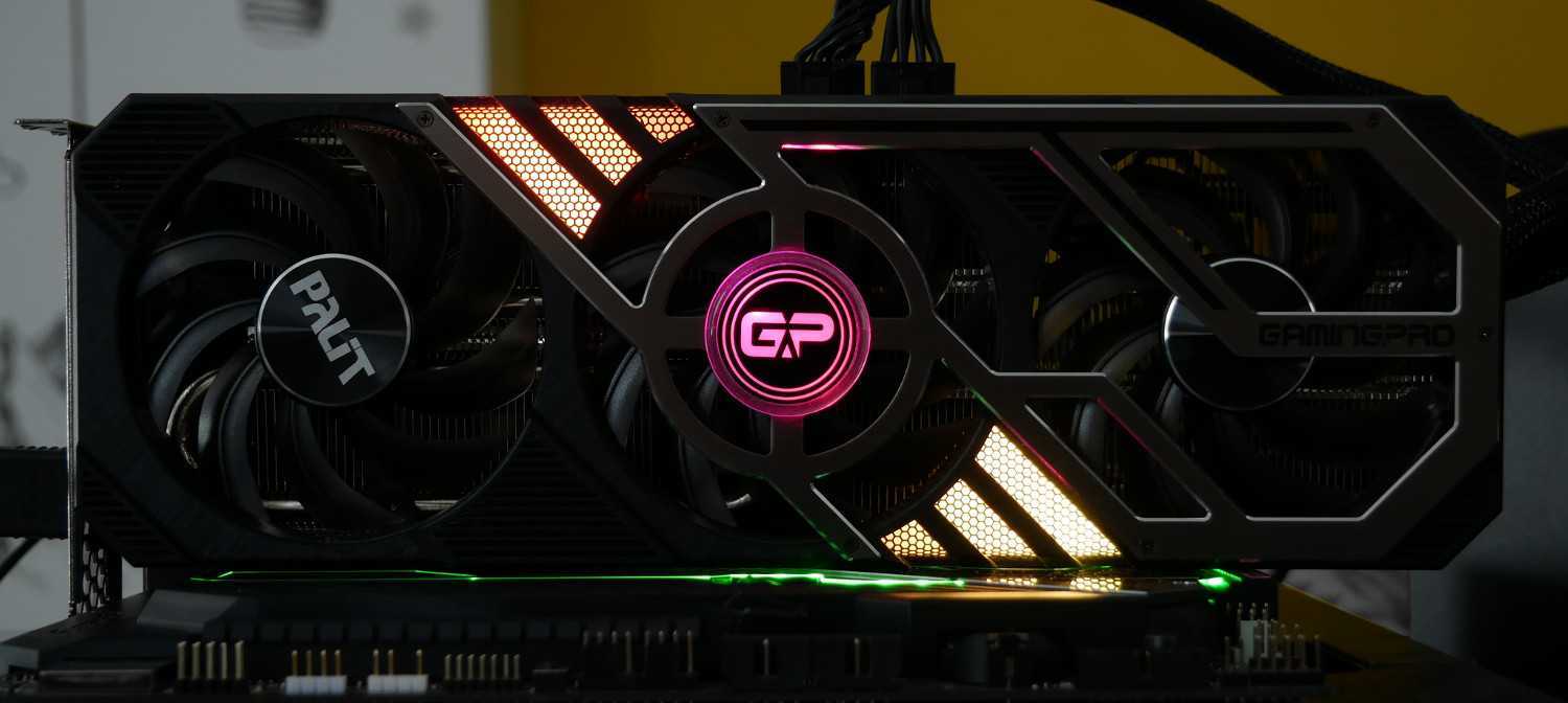 Младшая модель Palit GeForce RTX 3070 Ti GamingPro значительно сдержаннее (для ее демонстрации мы воспользовались открытым стендом). Здесь подсветку получила центральная секция с параллельными линиями и логотипом серии GP.