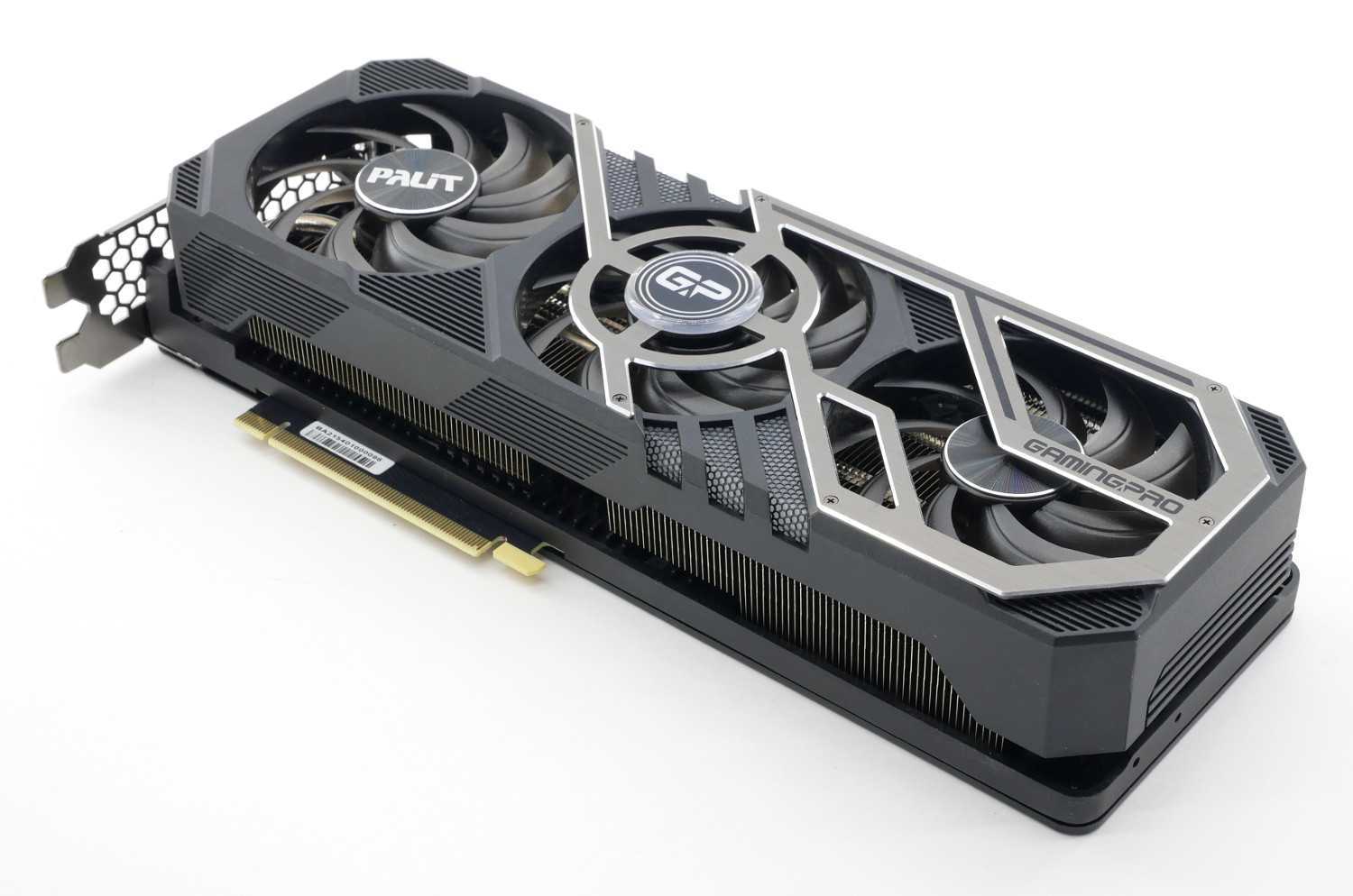 При создании Palit GeForce RTX 3070 Ti GamingPro производителю удалось добиться гармонии и приемлемых размеров: длина видеокарты не достигает 300 мм, но пришлось частично пожертвовать толщиной — модель занимает три слота расширения. Вентиляторы компактно вписываются по длине и накрывают большой радиатор по всей площади.