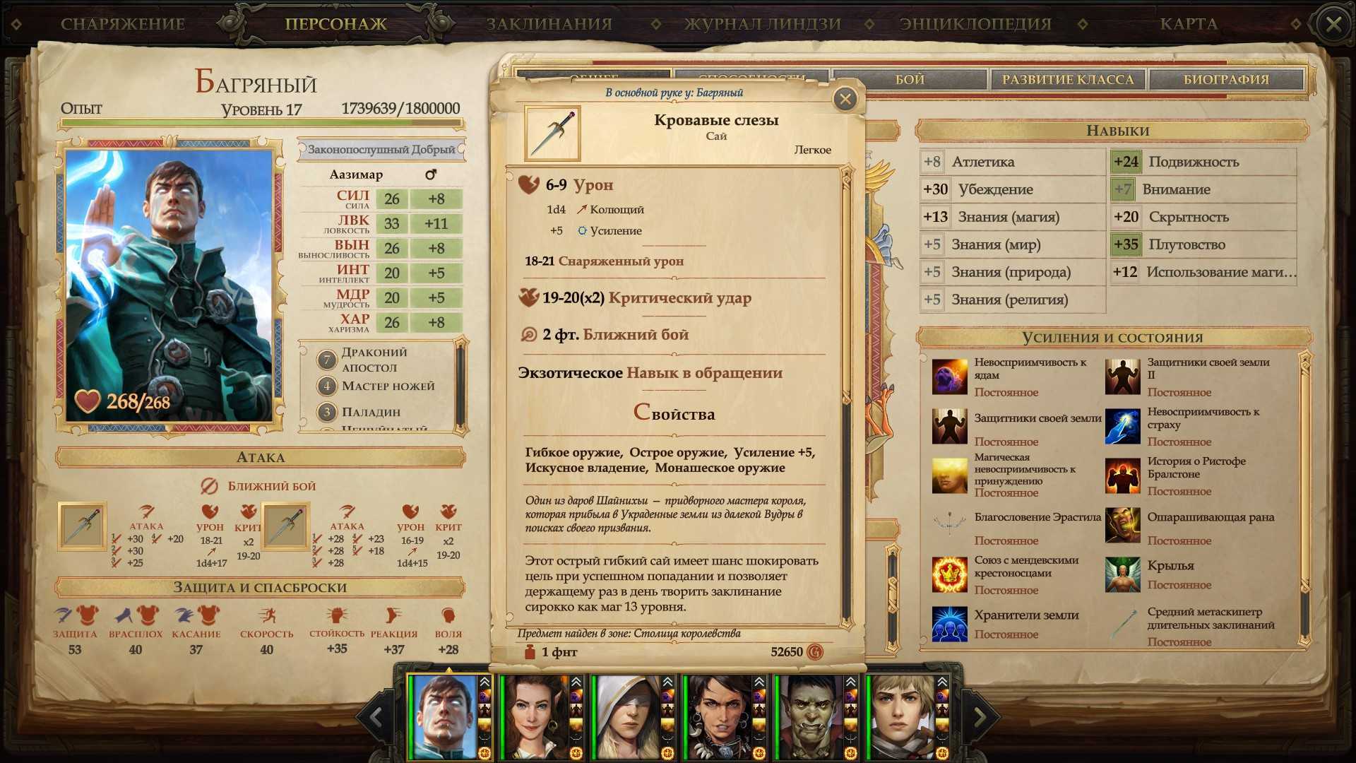 - Классовые навыки: атлетика, знание (мир), знание (природа), убеждение