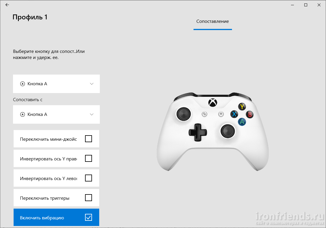 Здесь можно сопоставить любую кнопку геймпада с любой другой, поменять местами стики, инвертировать оси (например, для управления воздушной техникой), поменять местами триггеры (LB и RB), а также отключить вибрацию.