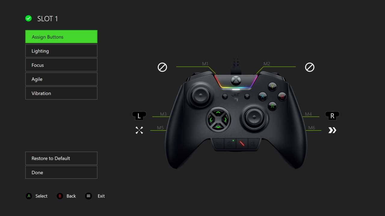 Очевидно, что приложение Razer Wolverine для Xbox — это приложение Xbox One, быстро перенесенное на Windows 10, потому что вы не можете управлять им с помощью мыши или клавиатуры. Вам нужно использовать Росомаху для навигации по всем меню и изменения всех настроек, что немного неудобно. Настройка в Windows также намного менее надежна, чем с геймпадами Astro C40 или Xbox Elite Series 2. Вы можете запрограммировать шесть кнопок на задней панели с любым входом или установить любую из них на Focus (уменьшить чувствительность на аналоговом джойстике) или Agile (увеличить чувствительность на любом аналоговом джойстике), но вы не можете перепрограммировать стандартные лицевые кнопки или триггеры.