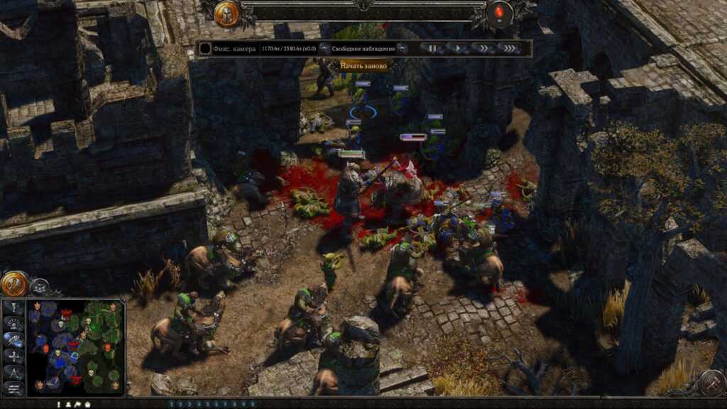 Кнопка, на которой изображен домик, вызывает меню строительства. Слева от нее демонстрируется уровень вашего героя. В самом крайнем правом окошке, которое по размером сопоставимо с мини-картой, отображается меню сооружения, которое вы ранее выбрали. В нем можно создать новых юнитов, повысить уровень здания и так далее. «Центр Поселения», например, имеет дополнительную опцию под названием отзыв рабочих, при использовании которой работники прекращают все свои дела и возвращаются к Центру – это может помочь спасти им жизнь при нападении на базу вражеских солдат. Кстати, для увеличения количества рабочих стоит повышать уровень данной постройки.