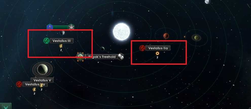 Во время исследования научный корабль может обнаружить новые планеты, которые можно колонизировать. На скриншоте выше есть два символа планет. Зеленый — это планета, которая отвечает потребностям вашего населения. Для колонизации красных планет вам потребуются дополнительные социологические исследования, благодаря которым вы сможете сделать так, чтобы неблагоприятные планеты соответствовали потребностям вашего населения.