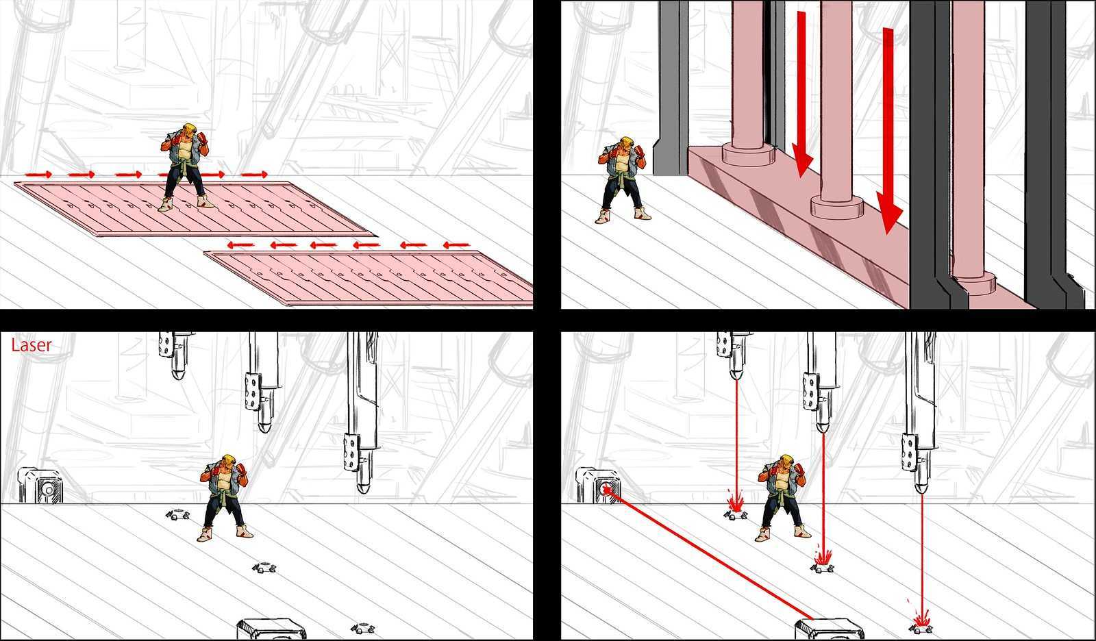 This stage type will have triggers that can launch either crushing traps, darts, or a health item. You can kite enemies to your location and then launch these traps to hurt foes. These triggers activate once, unless they shoot out darts in which case you can use it multiple times.