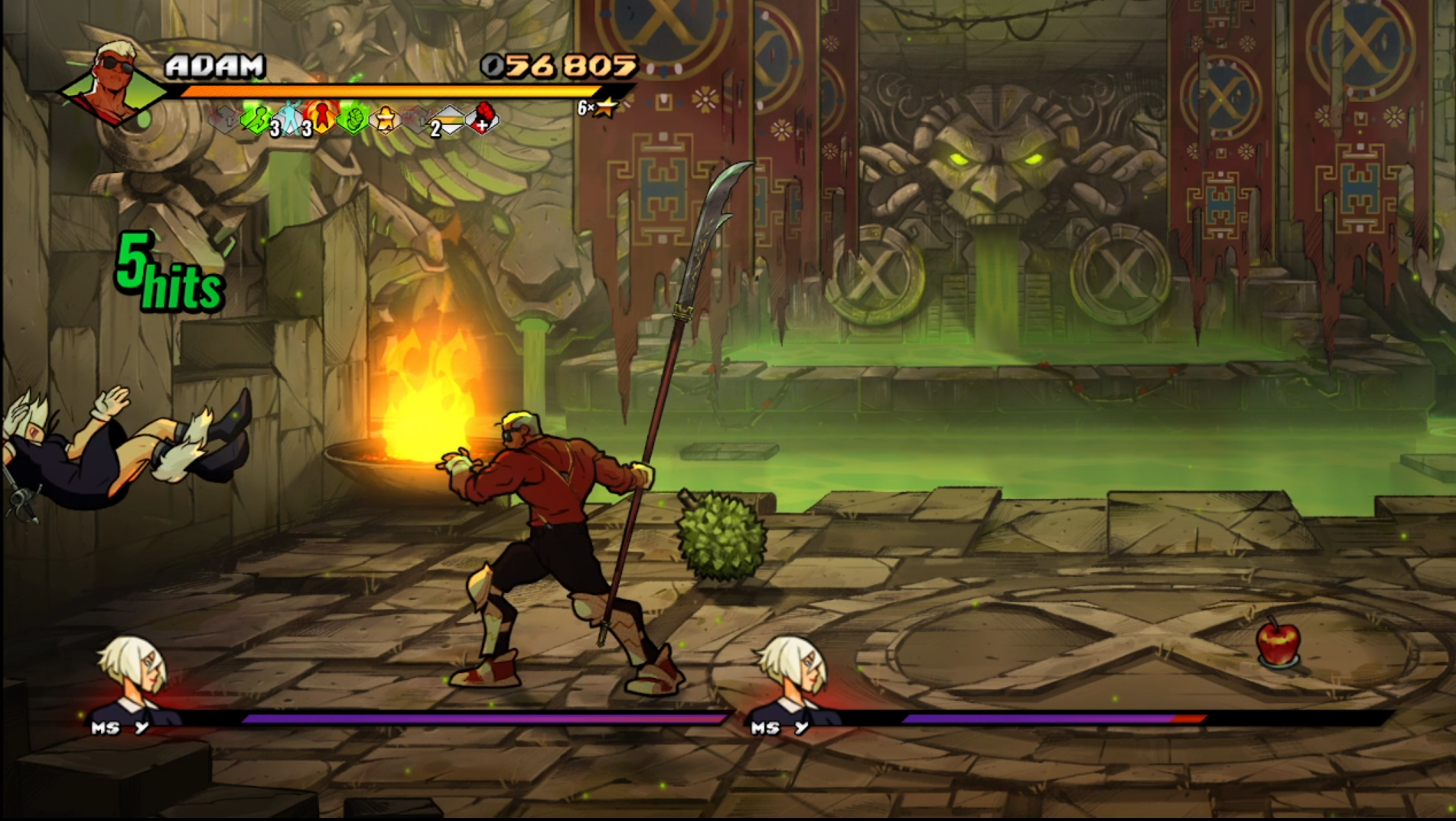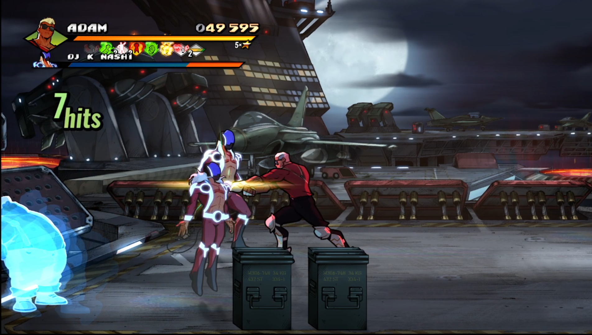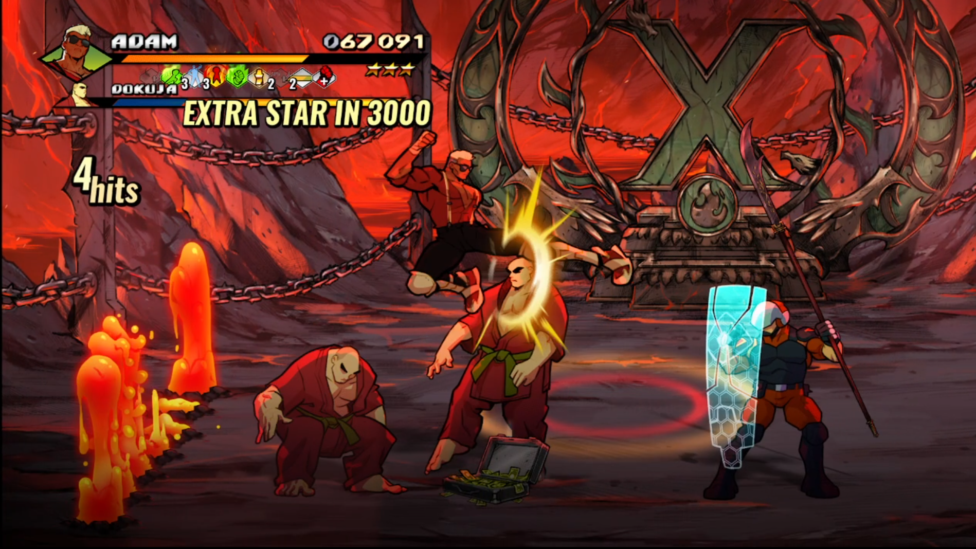 Another major addition are the Star Moves; these are limited use moves which consume the star icons below the player’s healthbar and deal massive damage to multiple enemies at once, while also making the player completely invulnerable for its entire duration (except for a few, namely Shiva’s Spirit Dance and Max’s Iron Will). Players always start with one Star Move by default at the start of each stage, and can find hidden around the stages are Star icons, which add a Star Move stock when collected.