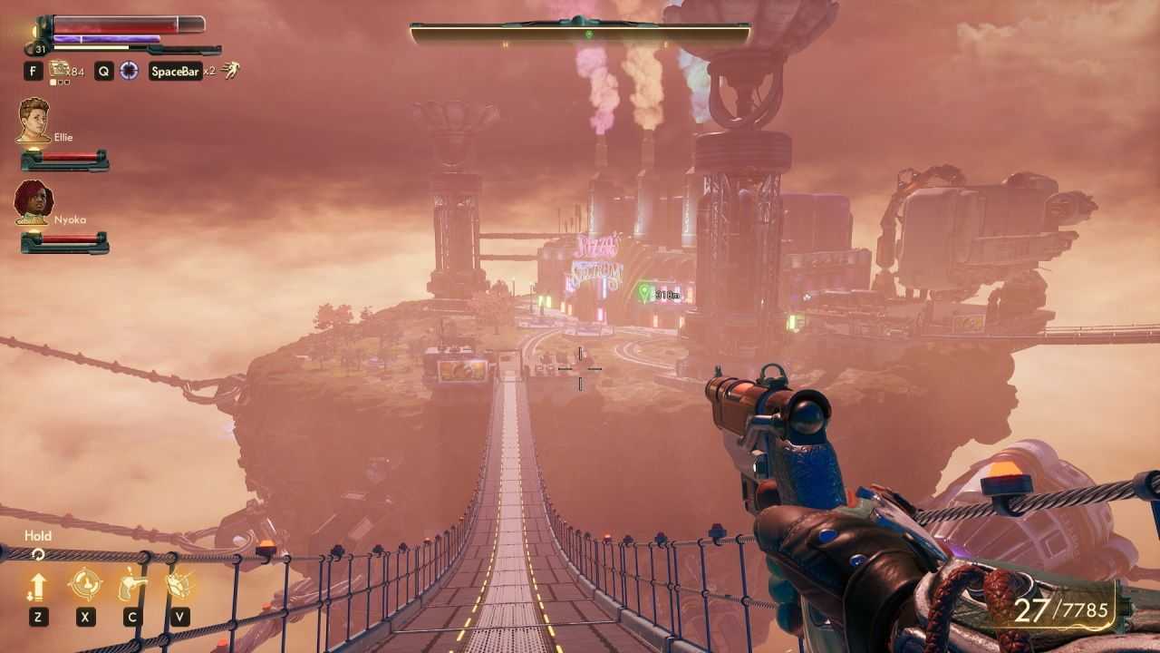 It helps that the new planet you explore is a bit different than anything we’ve seen so far in The Outer Worlds. Eridanos itself is an uninhabitable gas giant, but Rizzo’s has built a small set of islands kept aloft by giant rocket engines. Floating through the planet’s atmosphere, these islands are connected by long suspension bridges.