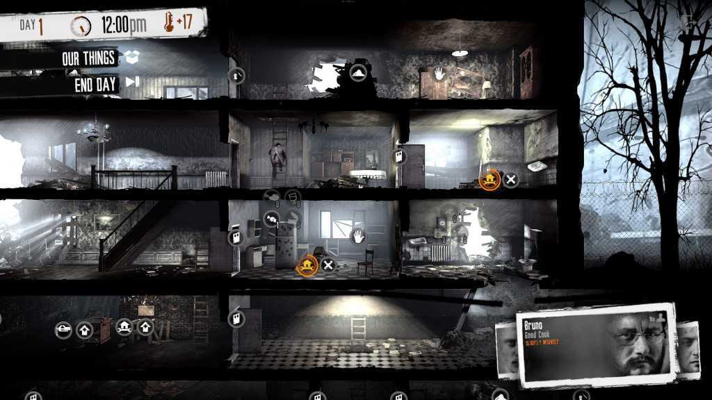 Как уже говорилось ранее, «дневной» геймплей в This War of Mine представлен в формате своеобразного survival-симулятора. Причем аспект выживания и прогресса поселенцев тут реализован на редкость хорошо. Сначала люди, находящиеся под управлением пользователя, закрывают свои базовые потребности. Они сколачивают из досок ящики и кровати, баррикадируют окна и занимаются фильтрацией дождевой воды. Затем цели и задачи растут в геометрической прогрессии, ведь при должном оснащении члены команды с лёгкостью займутся обустройством небольшого табачного завода или фермы.