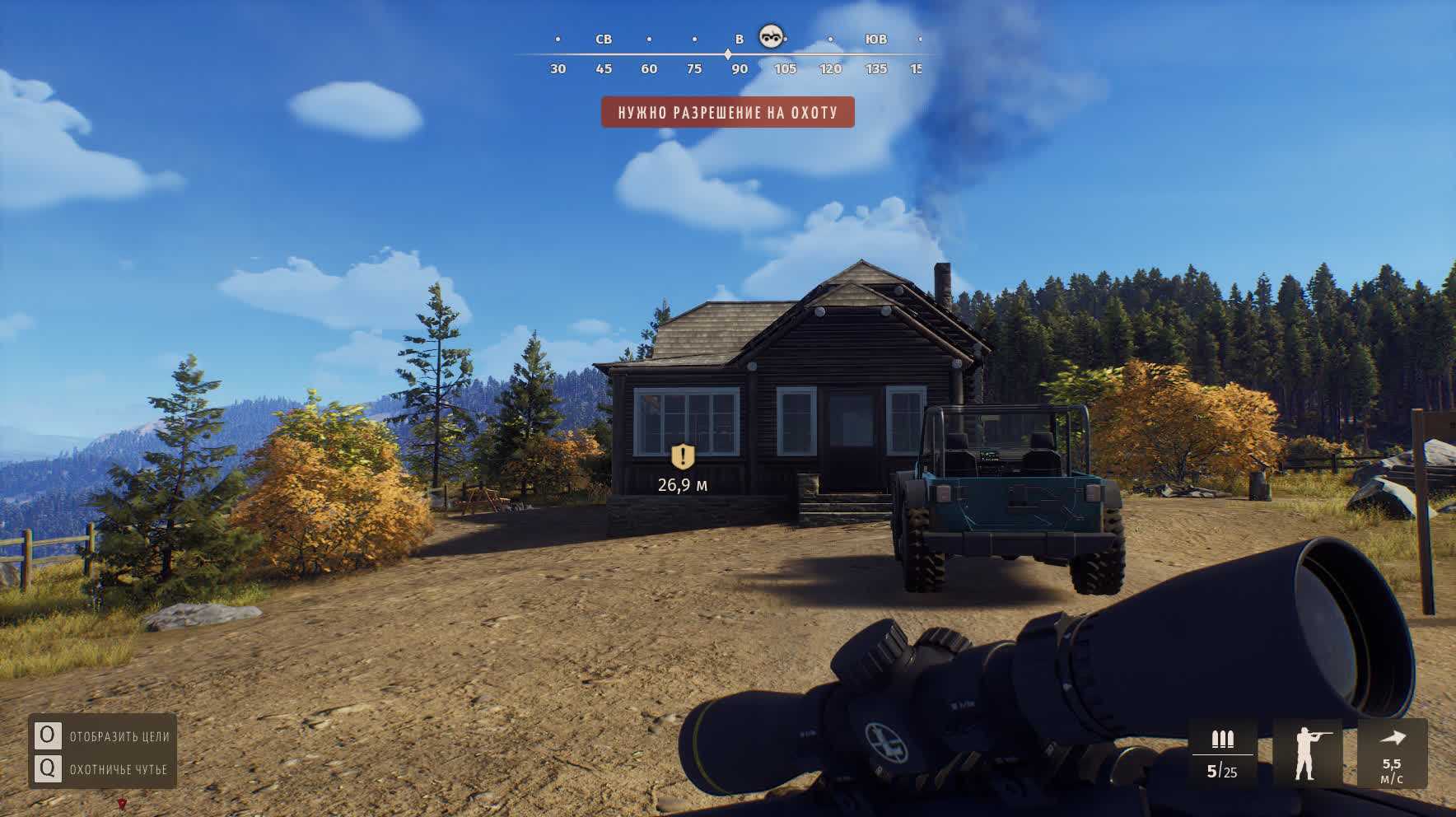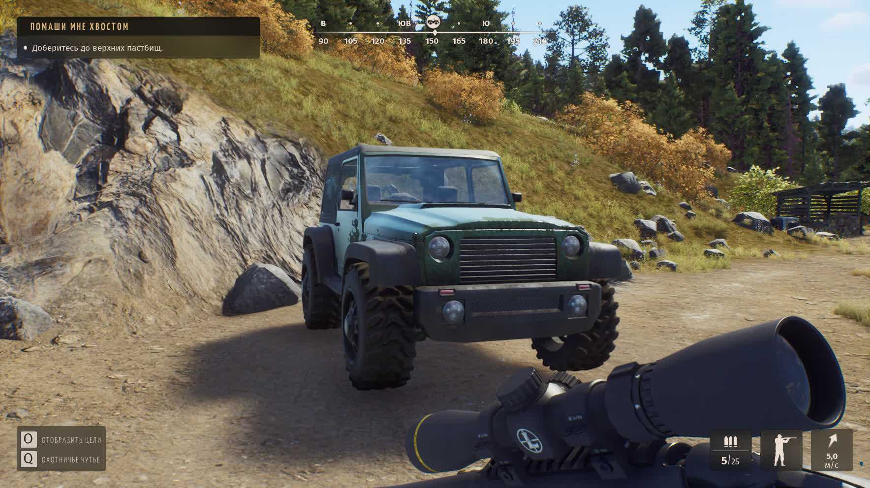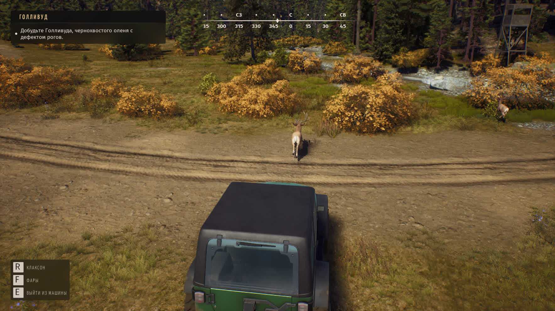 О том, что дичь пугается каждого шороха, но далеко не всегда, я уже написал. Дошло до того, что я начал просто колесить по карте на внедорожнике и сбивать цели, вместо стрельбы по ним из винтовок. Так оказалось быстрее и проще, правда, работало только с наземными животными — птиц мочил «ручками», через снайперские прицелы.