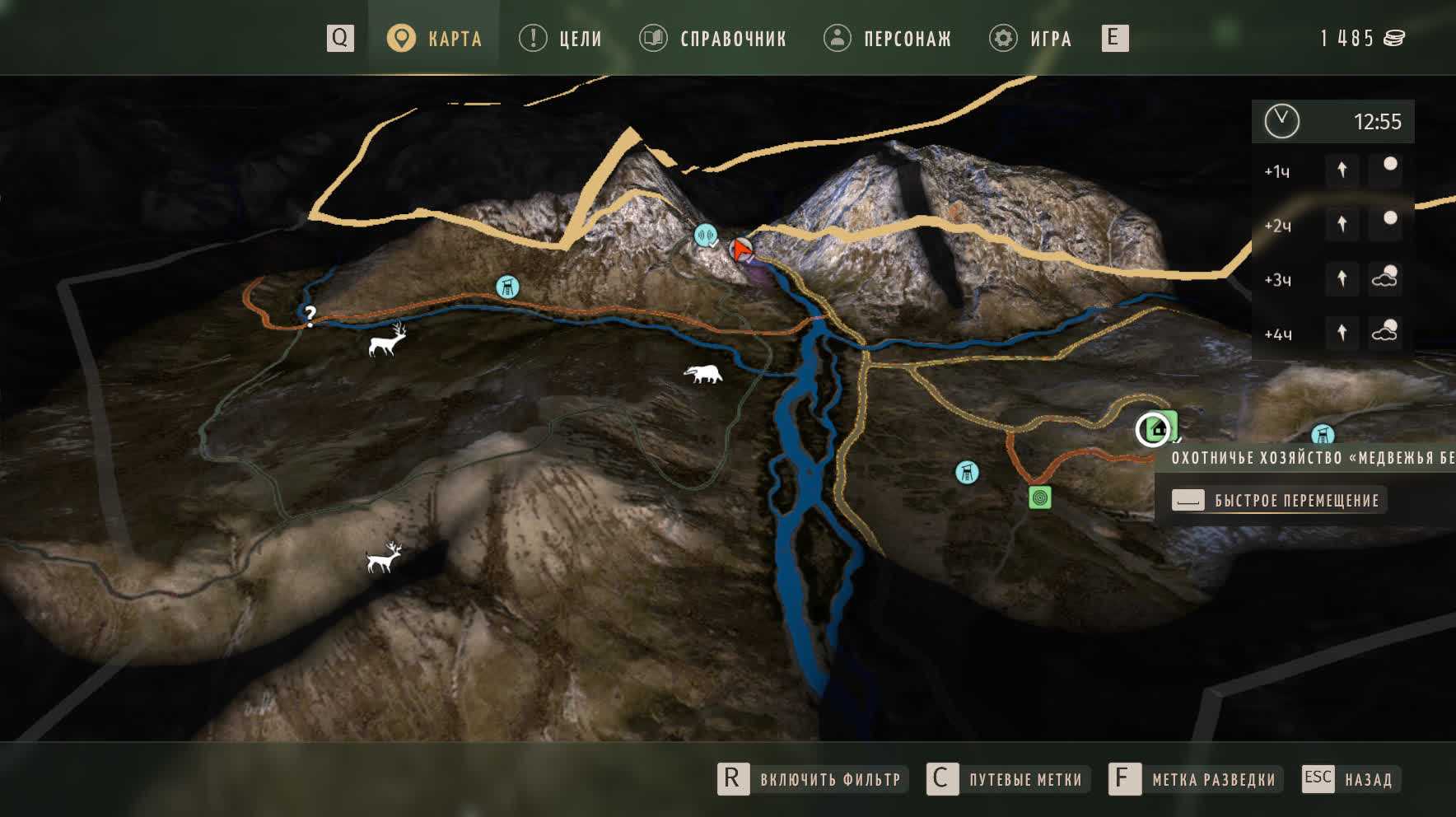 На карте несколько основных объектов — охотничьи домики (героя и NPC), охотничьи лагеря для отдыха, вышки, стрельбища, достопримечательности. Из всего этого я 99% времени пользовался только охотничьими домиками, потому что в них можно спать (перематывать время), заказывать снаряжение, получать задания и призывать машину.