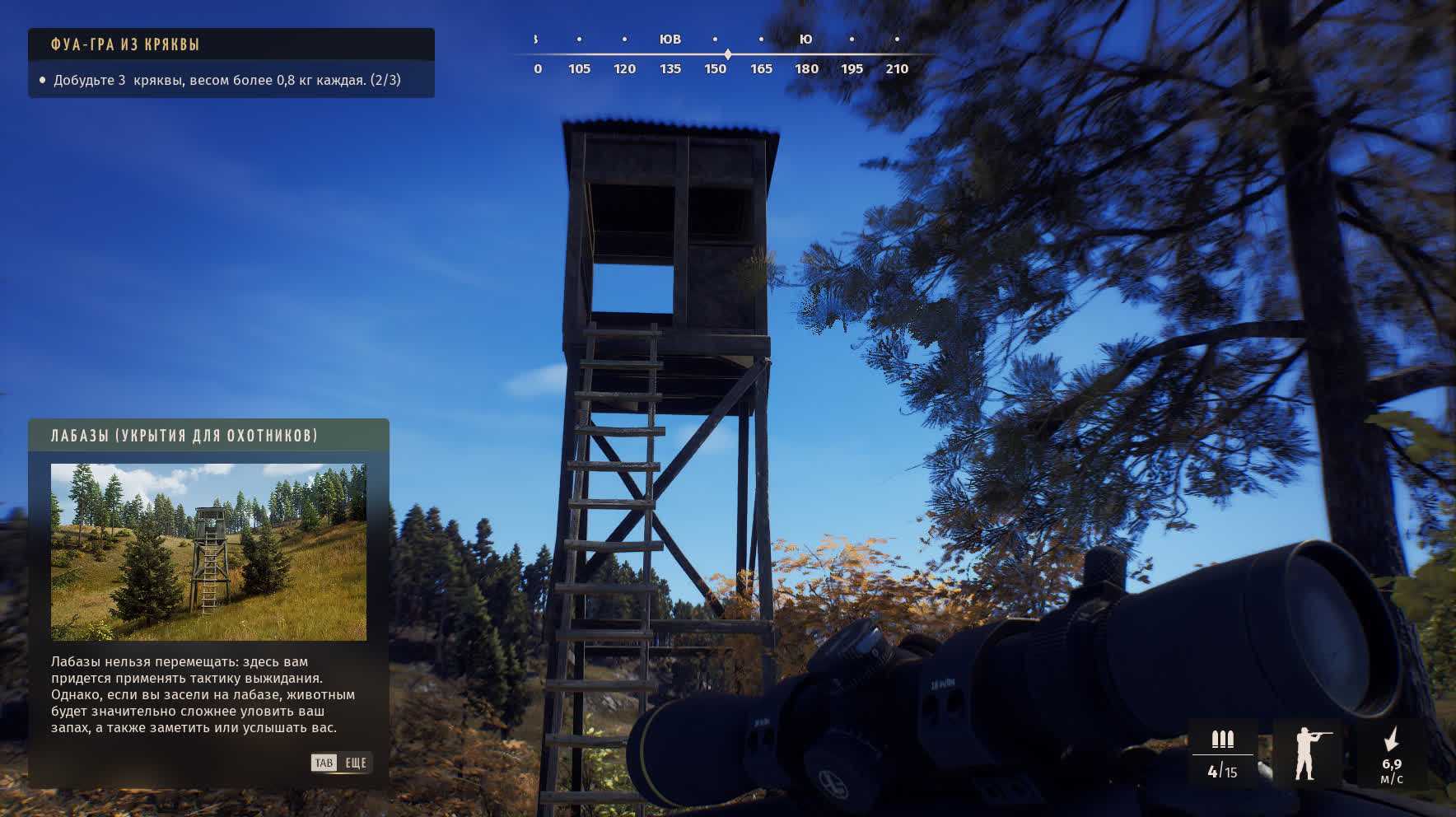 Лабаз (укрытие для охотника). Разработчики на полном серьезе предлагают здесь сидеть и ждать, пока появится дичь. Просто сидеть и ждать. Я попробовал — на двадцатой минуте задергался глаз и я ушел от греха подальше.