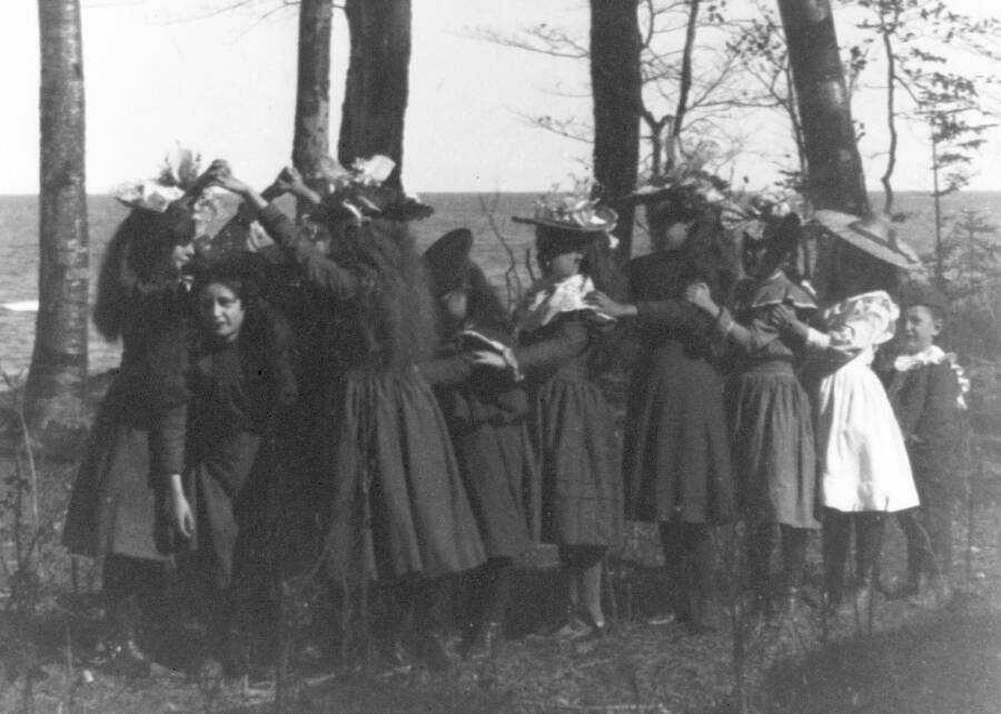 Library of CongressA group of school girls play the London Bridge game in 1898.