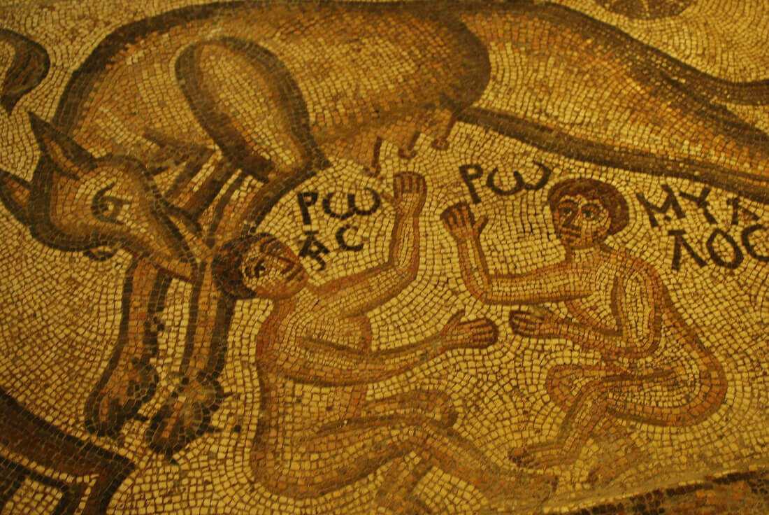 Фото детали мозаики с изображением Ромула и Рема, детей Марса и Реи Сильвии, брошенных и воспитанных волчицейФреска найдена в Мааррат аль-Нуман (Сирия)