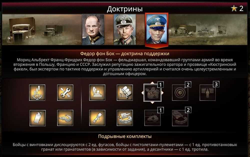 Ценности в самих звездочках немного — они предназначены для прокачки веток доктрин, которые выбираются перед стартом каждой миссии. Независимо от выбранной кампании, игроку предлагают троих лидеров со своими доктринами (пехота, бронетанковые войска и поддержка), и в каждой ветке можно активировать бонусы (если на это хватает звезд): увеличить радиус обзора для командира башни, когда тот открывает люк танка, вручить пехотинцам дополнительные гранаты или повысить дальность их броска, снизить получаемое бойцами количество урона и так далее. Вариантов немало, но подавляющее большинство модификаторов очень слабо влияют на происходящее, из-за чего вся затея кажется сырой и ненужной.