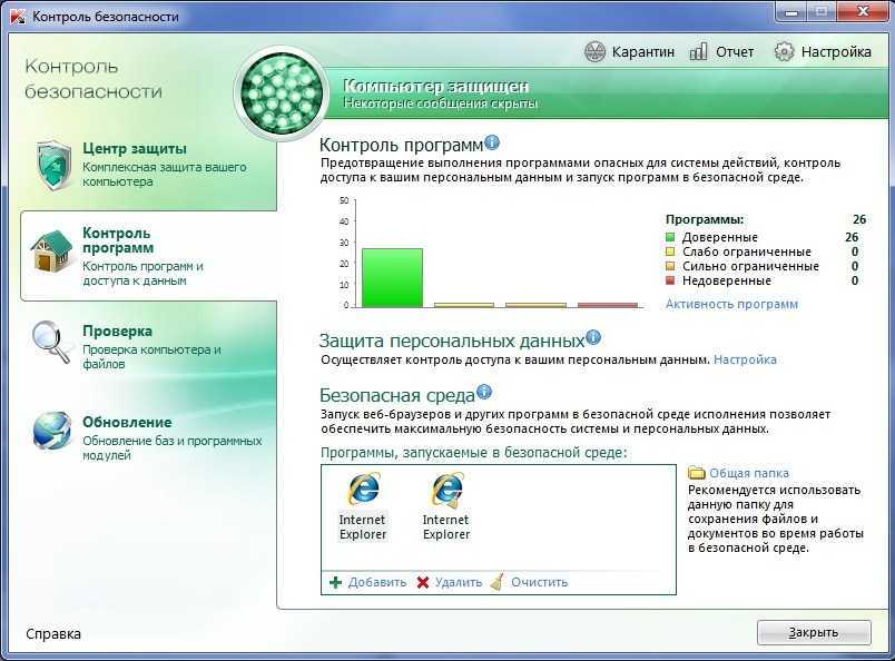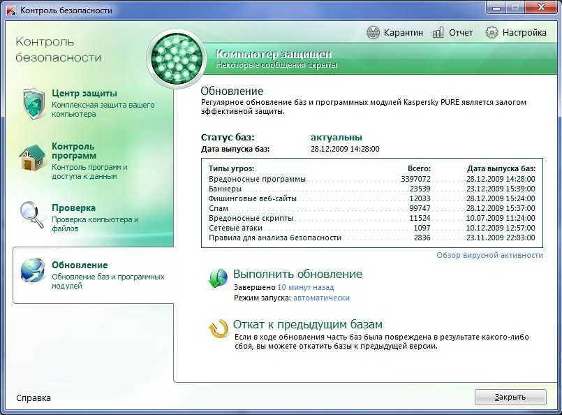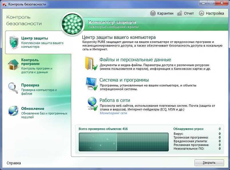 Компоненты «Контроля безопасности» обеспечивают защиту вашего компьютера от различных угроз, проверку всех объектов системы на вирусы и уязвимости, а также своевременное обновление антивирусных баз и программных модулей Kaspersky PURE.