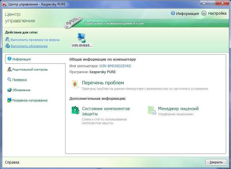 Он служит для удаленного управления программами Kaspersky PURE, установленными на компьютерах домашней сети, с какого-либо одного (главного) компьютера. Например, установив продукт на своем компьютере, вы можете управлять защитой компьютеров других членов семьи, естественно, при условии, что на них также установлен Kaspesky PURE.
