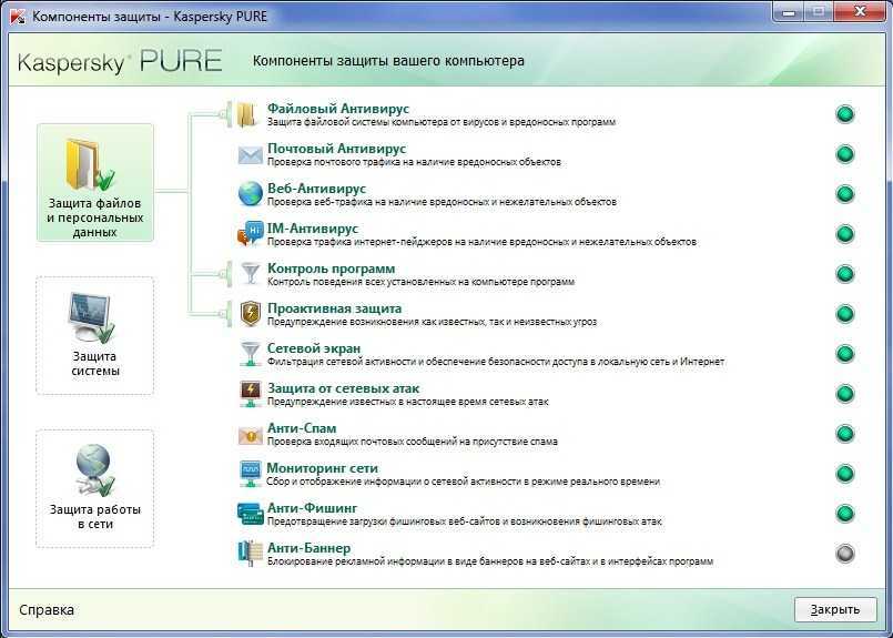 Рисунок 8: Перечень компонентов защиты в Kaspersky PURE