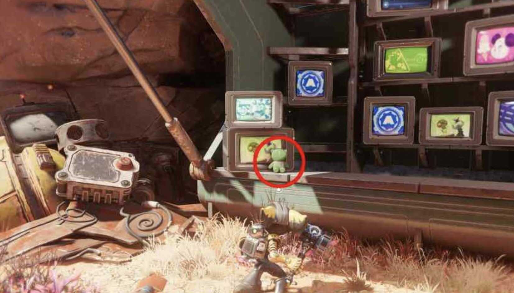 Вскоре после приземления на планету, после того как вы преодолеете пропасть с помощью хука, вы встретите миссис Зуркон. Прямо перед ней, справа, будет торговая лавка с несколькими телевизорами: на прилавке сидит крегмедведь.