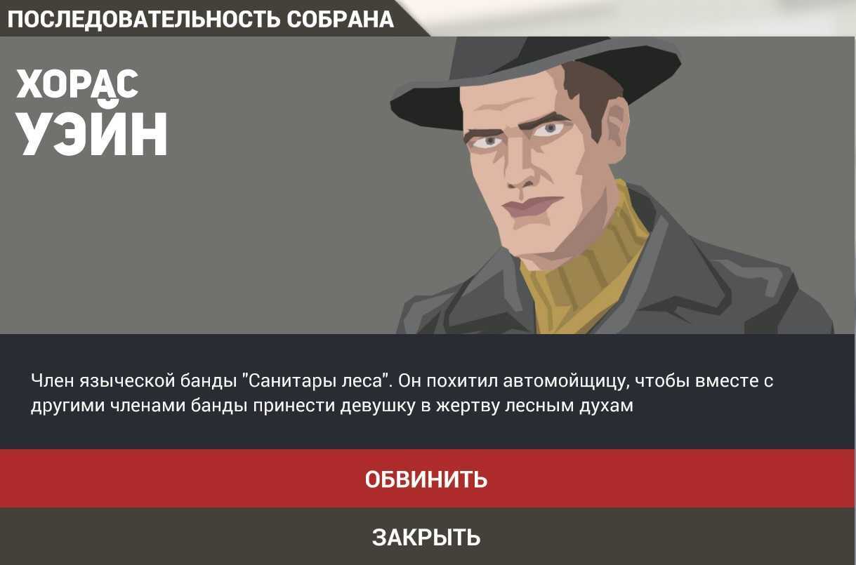 Собрав все кадры в нужной последовательности, вы сможете обвинить в преступлении некого Хораса Уэйна, который является членом секты «Санитары леса».