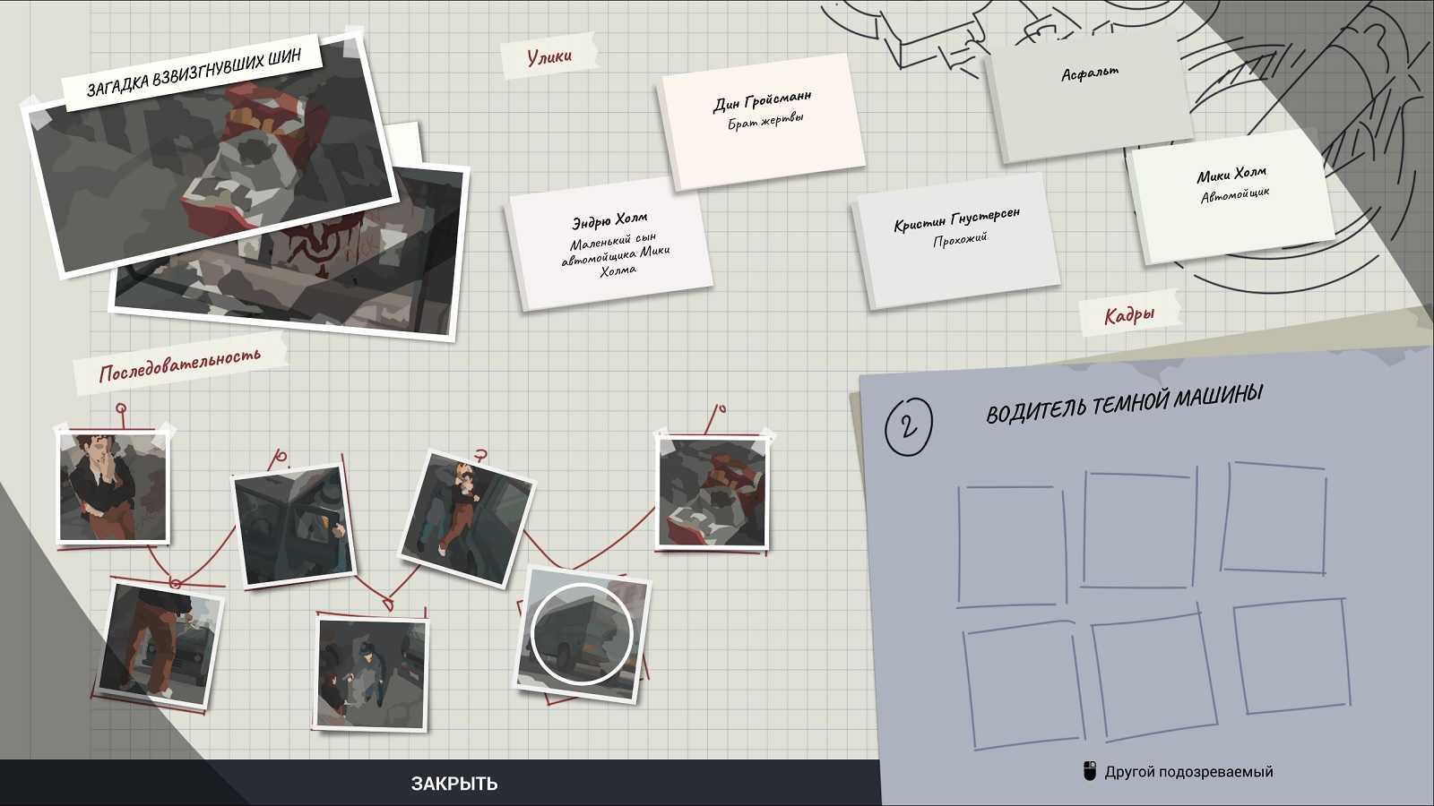 Получив все необходимые сведения, вам нужно будет направлять копов с интеллектом на расследование, для того чтобы добыть недостающие улики или же кадры. Виновный в преступлении — Водитель Темной машины.