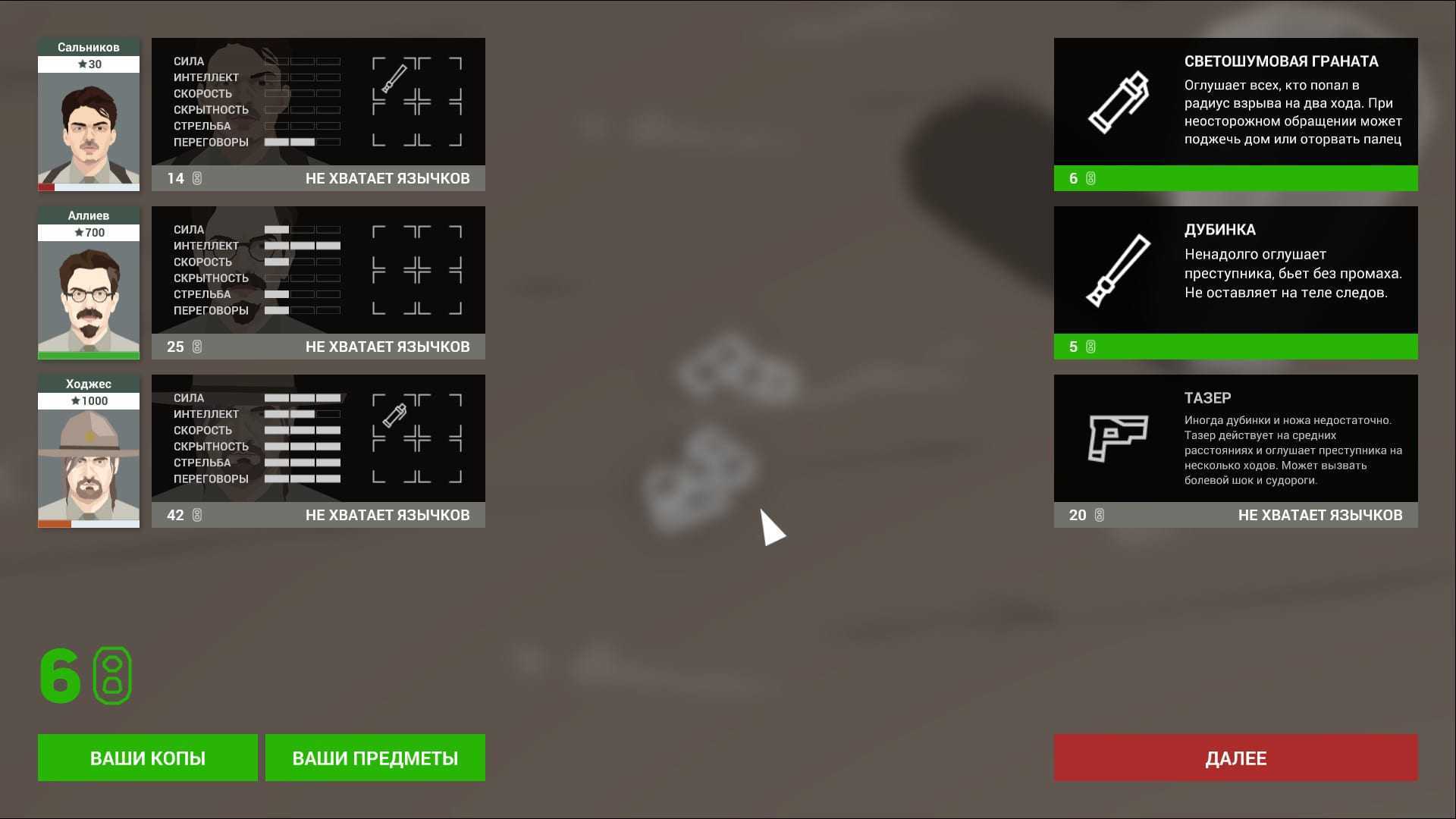 К некоторым вылазкам можно основательно подготовиться: спланировать атаку, подобрать нужных полицейских, обменять полезную информацию у случайных свидетелей на различные вещи из хранилища. Например, отдать конфискованный алкоголь бедняку, который видел преступников и знает точное их количество. На подобные сведения не стоит скупиться — зачастую именно от подобных знаний зависит успех операции.