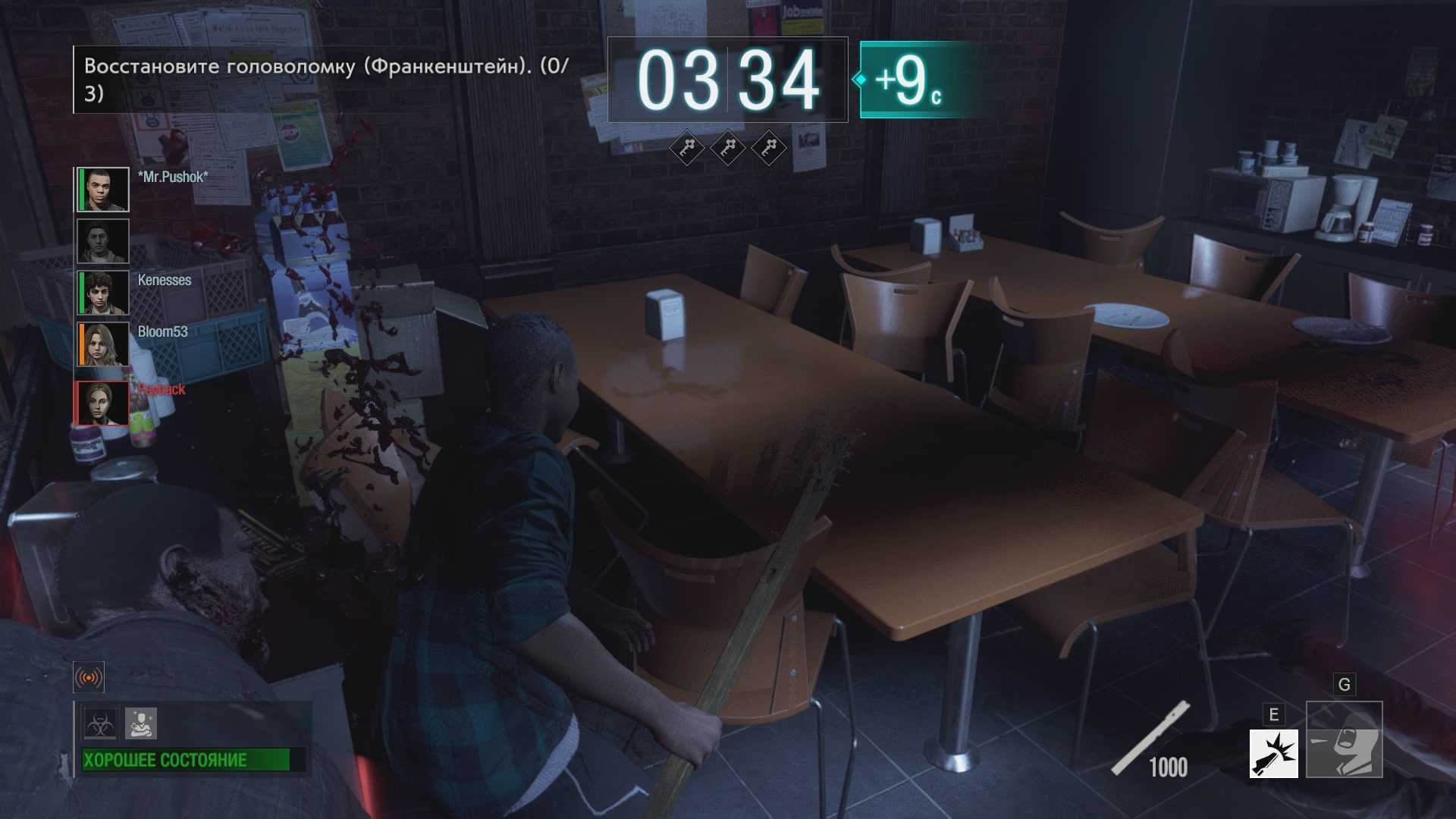 В ближнем бою тоже неудобно. Когда на тебя нападают хотя бы два зомби, ты оказываешься в смертельной опасности и даже не можешь маневрировать. Ведь локации состоят из очень узких коридоров, где невозможно обойти врагов по флангу. Приходится просто отступать назад. И это очень неприятно, ведь время ограничено.