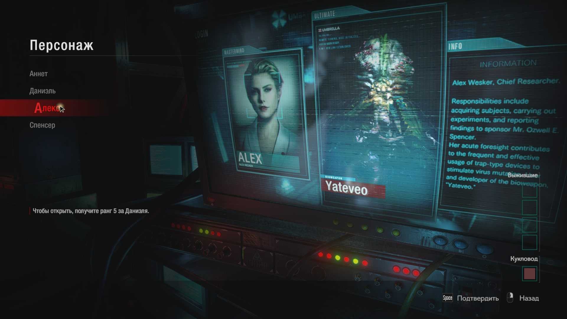 Спавнить можно как обычных зомбей, так и громадных зубастиков и даже Мистера Икс. Во-вторых, доктор может управлять призванными существами (в том числе Мистером Икс) удаленно, используя аналог VR-перчаток. В-третьих, он превращает камеры в турели и расстреливает выживающих. В-четвертых, у него в арсенале есть разнообразные ловушки, от отравляющих до замедляющих. Все это нужно использовать для того, чтобы замедлить выживающих и не позволить им дойти до финиша за отведенное время.