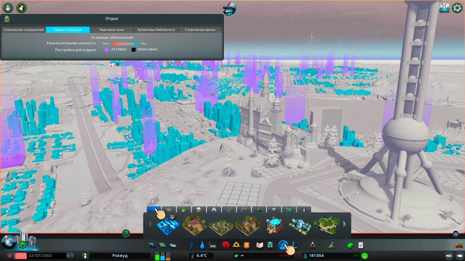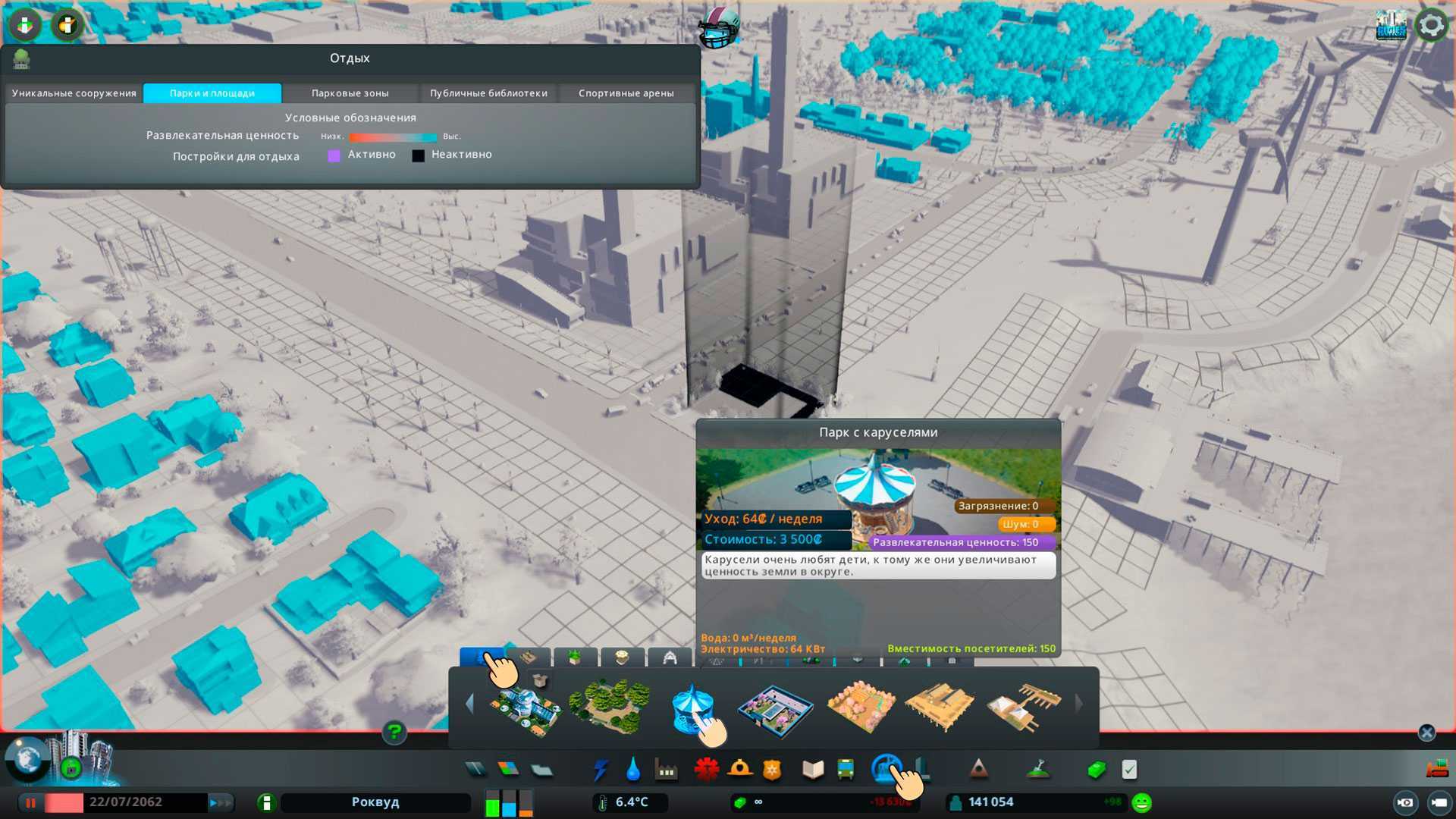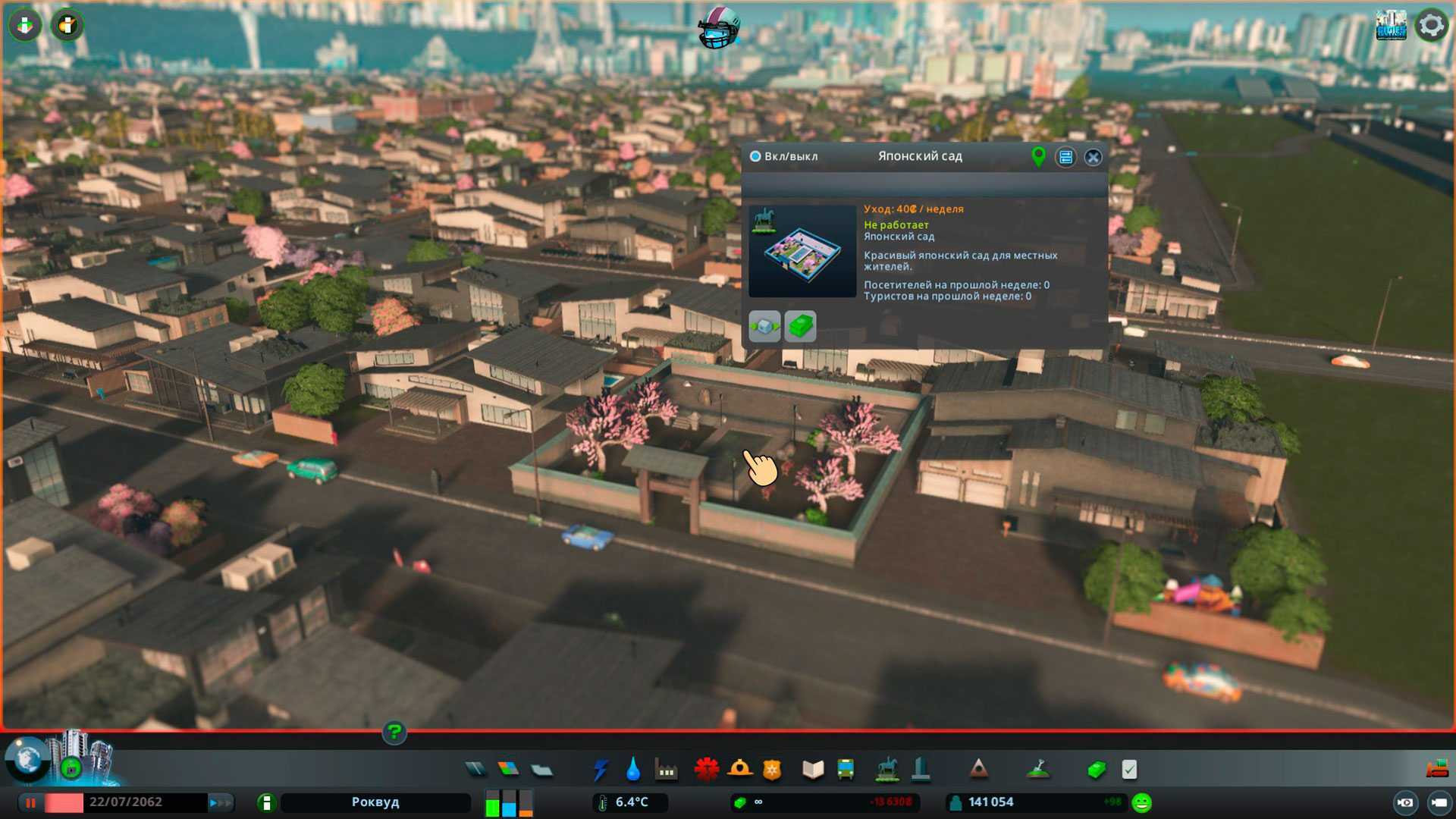 Каждая разновидность отличается не только размером, но и количеством развлекательной ценности и радиуса, распространения счастья. Из всех парков в данной вкладке, можно выделить «Японский сад». Он стоит крайне дешево, дает развлекательную ценность в 125 единиц и занимает всего лишь 4 на 4 клетки. Японский сад запросто можно разместить в даже самом густонаселенном районе города.