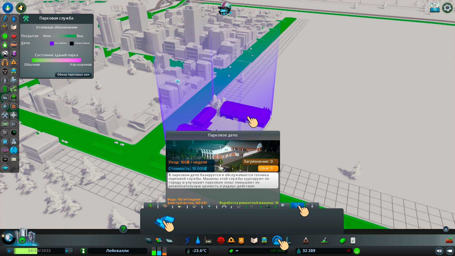 Для этого, на панели «Строительство», кликните на иконку «Парки и площади». Затем перейдите во вкладку «Парковая служба» и разместите здание, в удобном для вас месте.