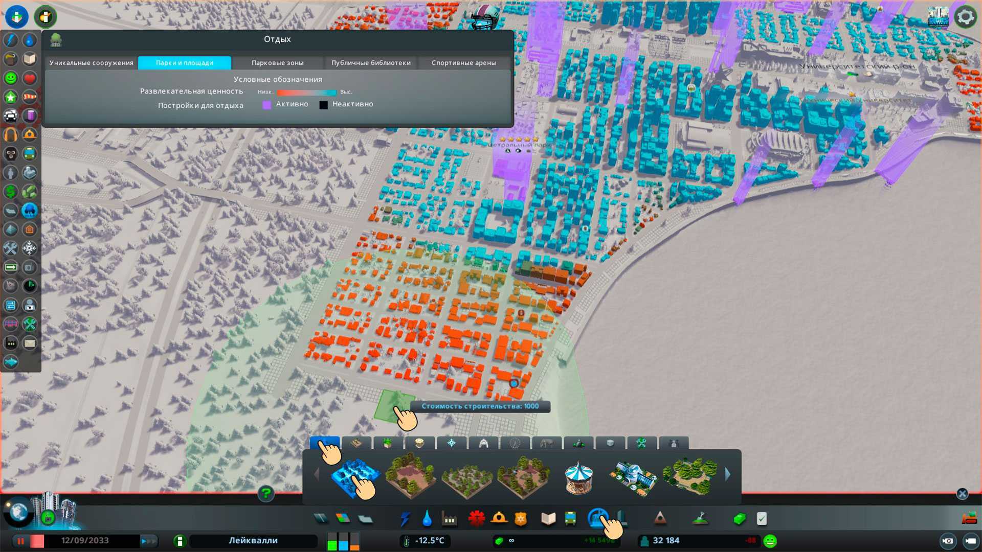 В данной вкладке преобладают прибрежные развлекательные зоны. Постройте уютную гавань или рыболовные туры. Для строительства подобных парковых зон, необходима водное пространство.